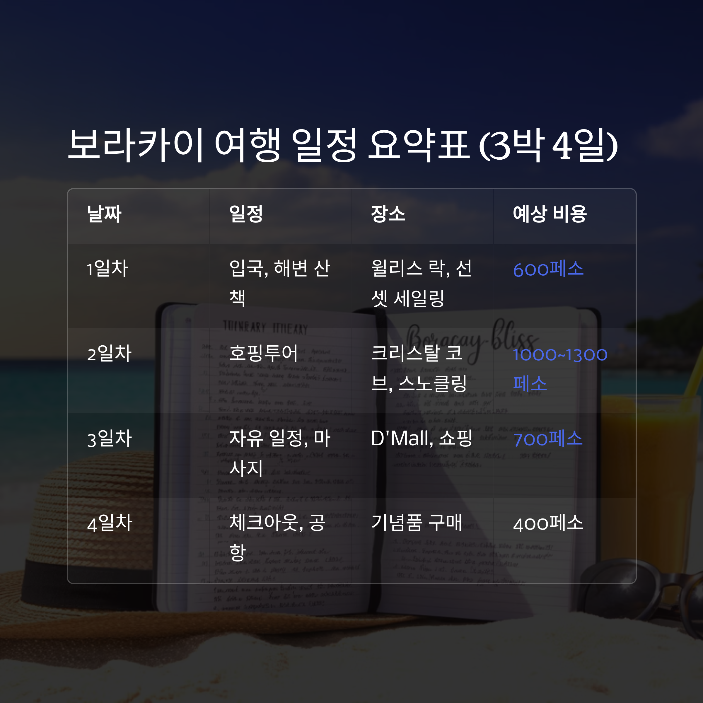 1일차 입국, 체크인, 해변 산책 윌리스 락, 화이트비치 선셋 세일링 약 600페소 2일차 호핑투어 + 크리스탈 코브 Crystal Cove 스노클링, BBQ 약 1000~1300페소 3일차 자유 일정, 마사지, D'Mall 쇼핑 D'Mall, Station 2 마사지, 쇼핑 약 700페소 4일차 체크아웃, 공항 이동 기념품 구매 유심 교체, 간단 식사 약 400페소