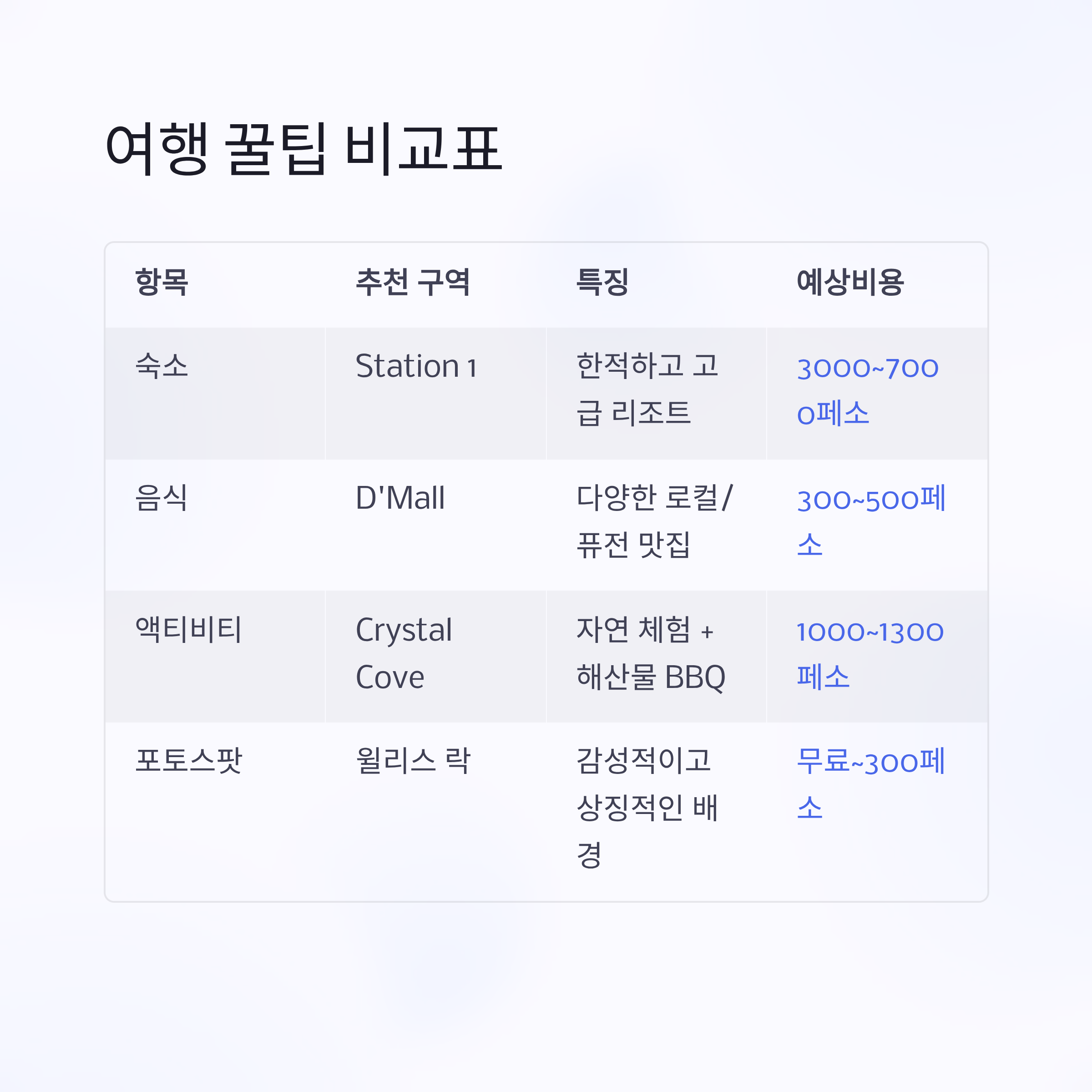 여행 꿀팁 비교표