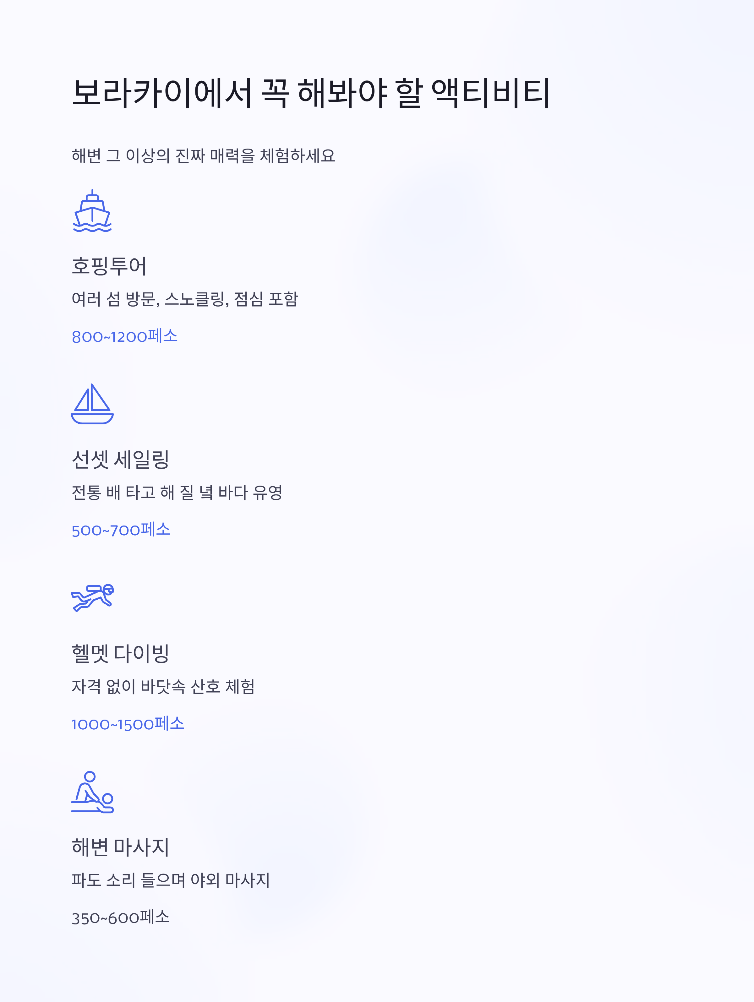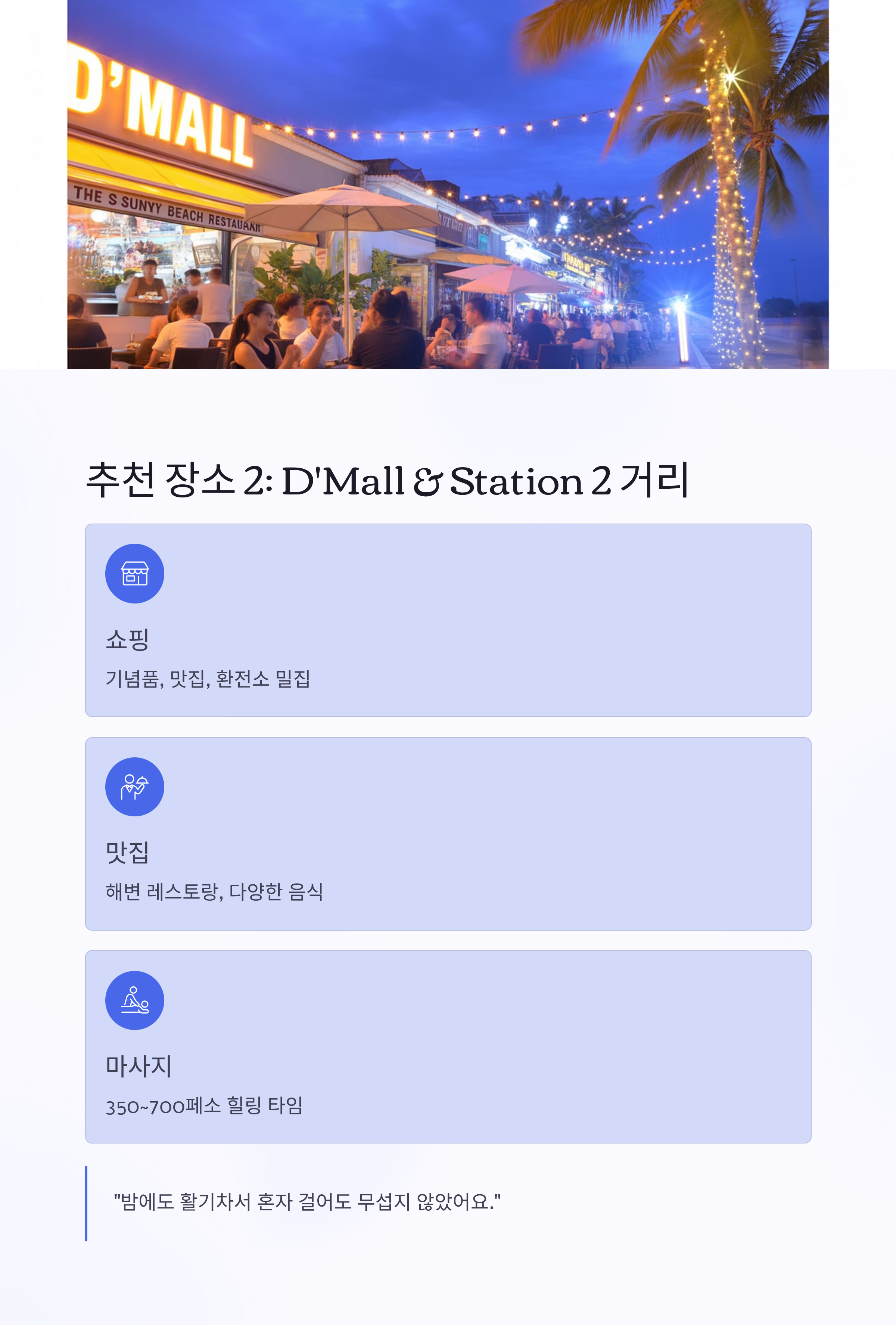 - 즐길거리: 기념품 쇼핑, 해변 레스토랑, 마사지