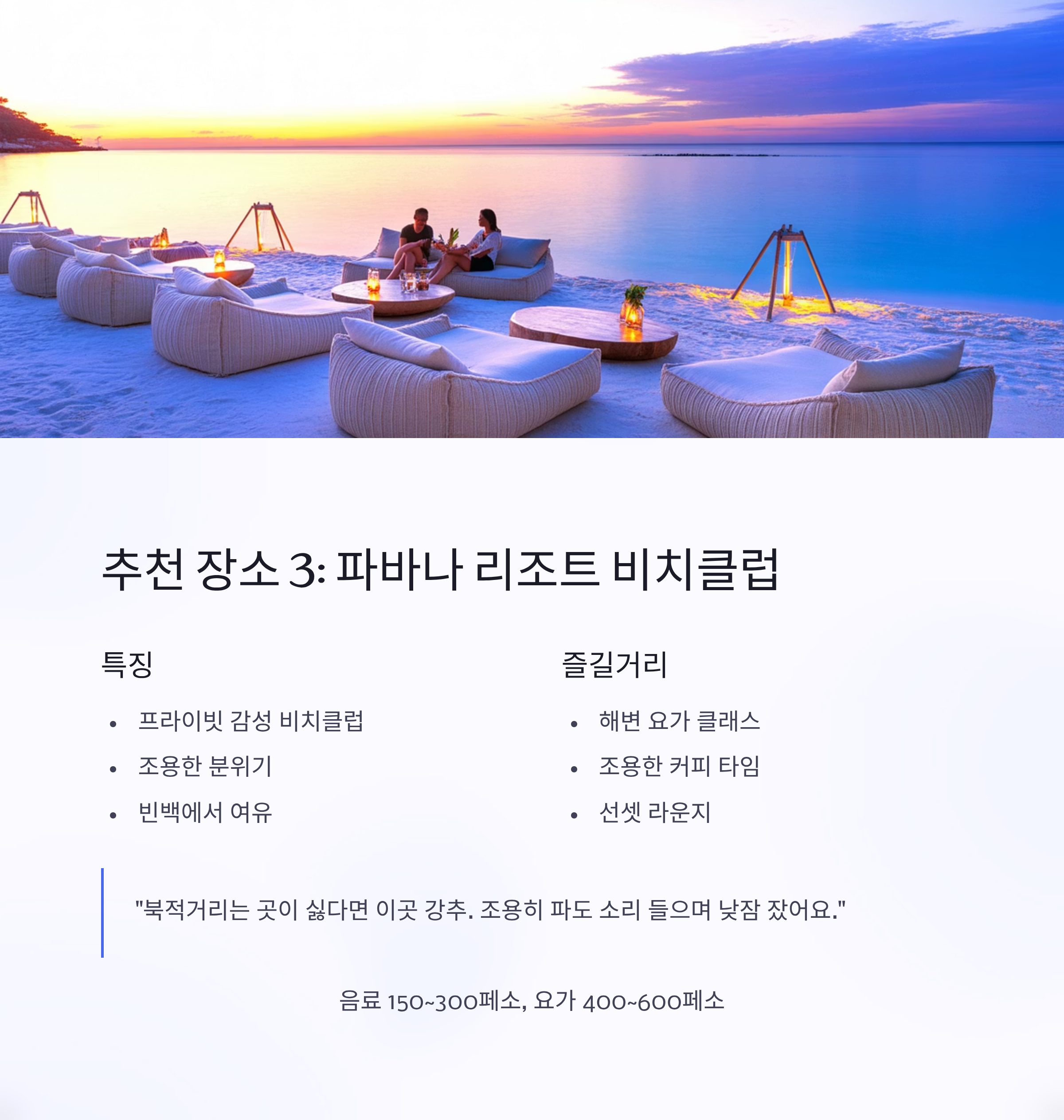 - 특징: 프라이빗 감성 비치클럽, 조용한 분위기