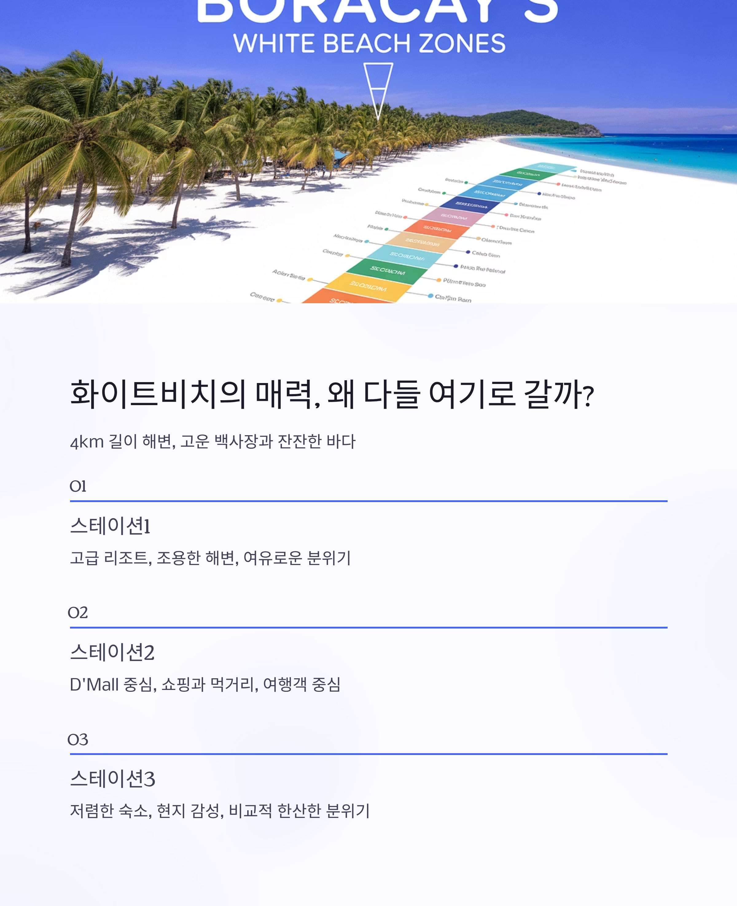 화이트비치는 크게 세 구역으로 나뉘며 각각 분위기가 다릅니다.