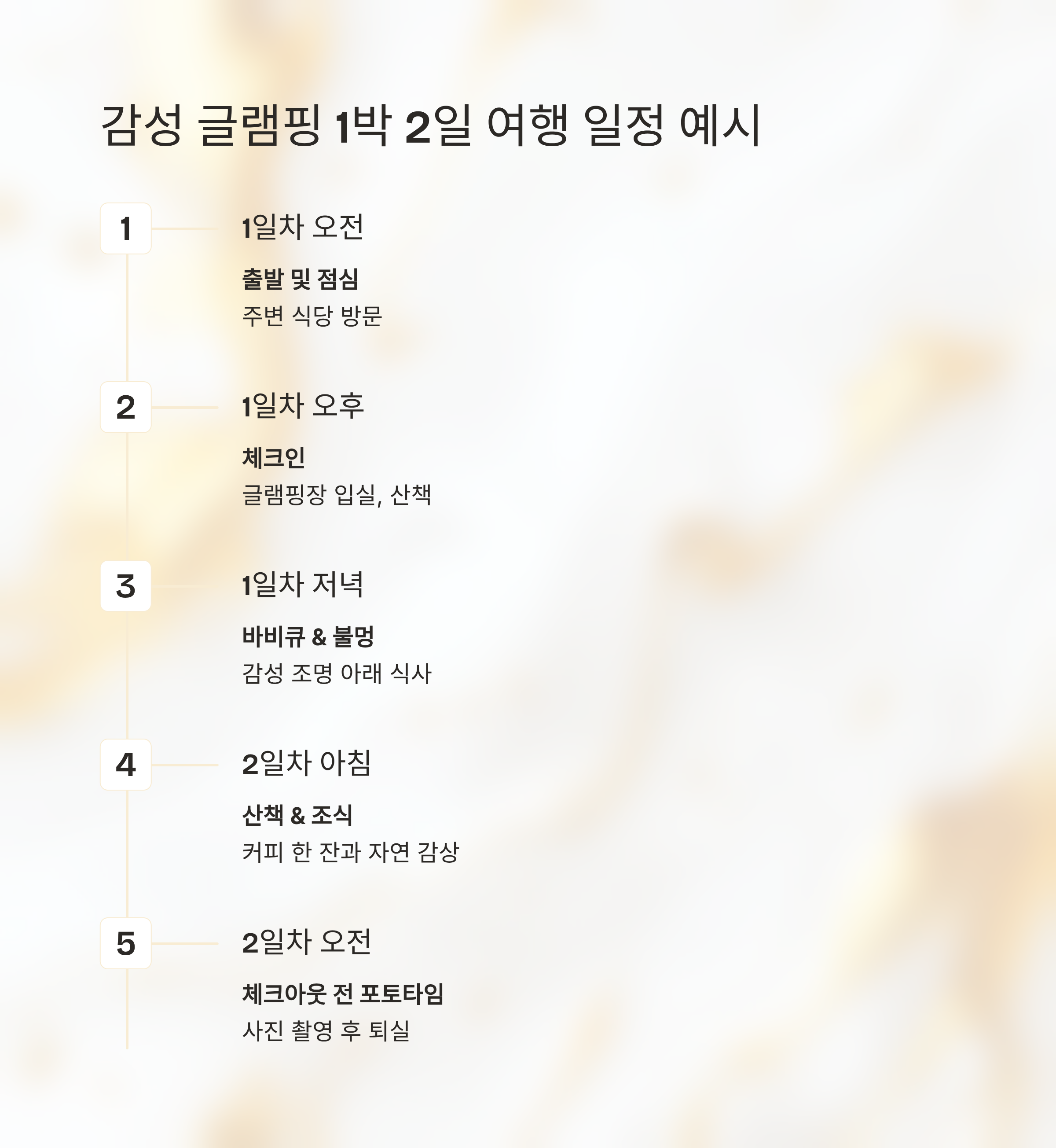 1일차 오전 출발 및 점심 주변 식당 방문 1일차 오후 체크인 글램핑장 입실, 산책 1일차 저녁 바비큐 & 불멍 감성 조명 아래 식사 2일차 아침 산책 & 조식 커피 한 잔과 자연 감상 2일차 오전 체크아웃 전 포토타임 사진 촬영 후 퇴실