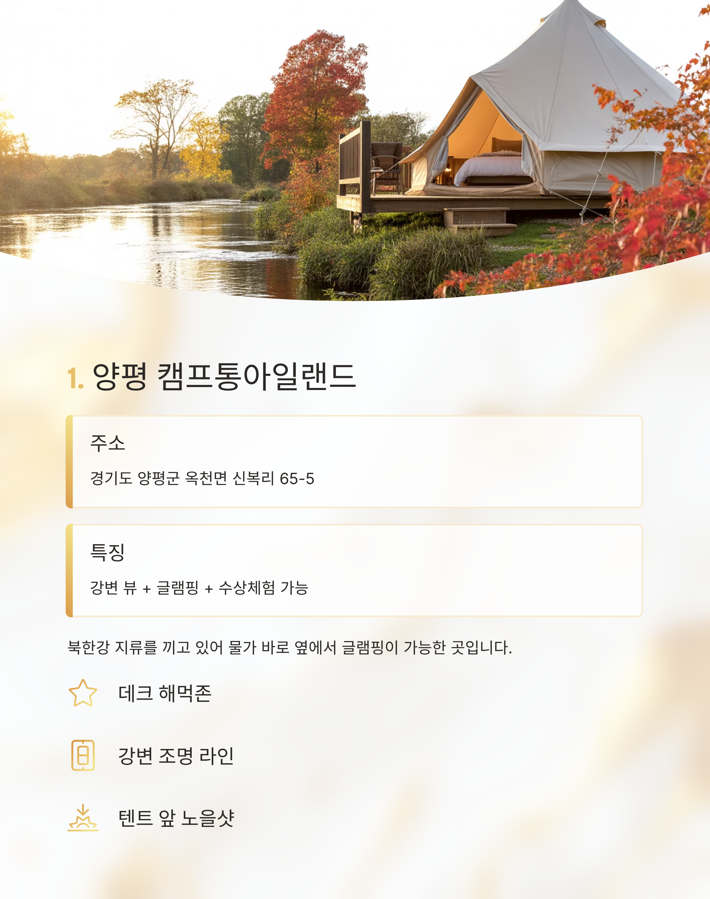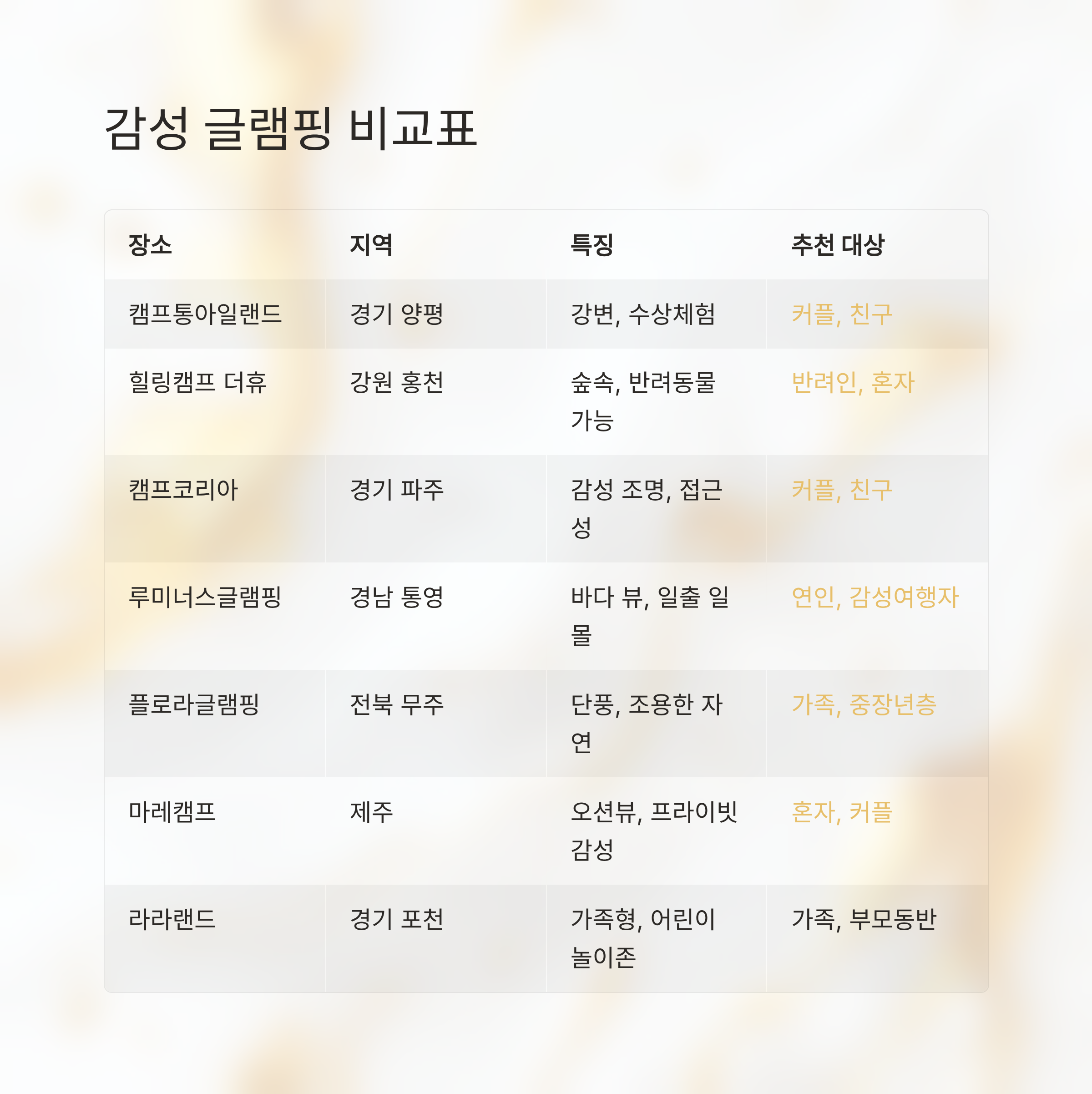 캠프통아일랜드 경기 양평 강변, 수상체험 커플, 친구 힐링캠프 더휴 강원 홍천 숲속, 반려동물 가능 반려인, 혼자 캠프코리아 경기 파주 감성 조명, 접근성 커플, 친구 루미너스글램핑 경남 통영 바다 뷰, 일출 일몰 연인, 감성여행자 플로라글램핑 전북 무주 단풍, 조용한 자연 가족, 중장년층 마레캠프 제주 오션뷰, 프라이빗 감성 혼자, 커플 라라랜드 경기 포천 가족형, 어린이 놀이존 가족, 부모동반