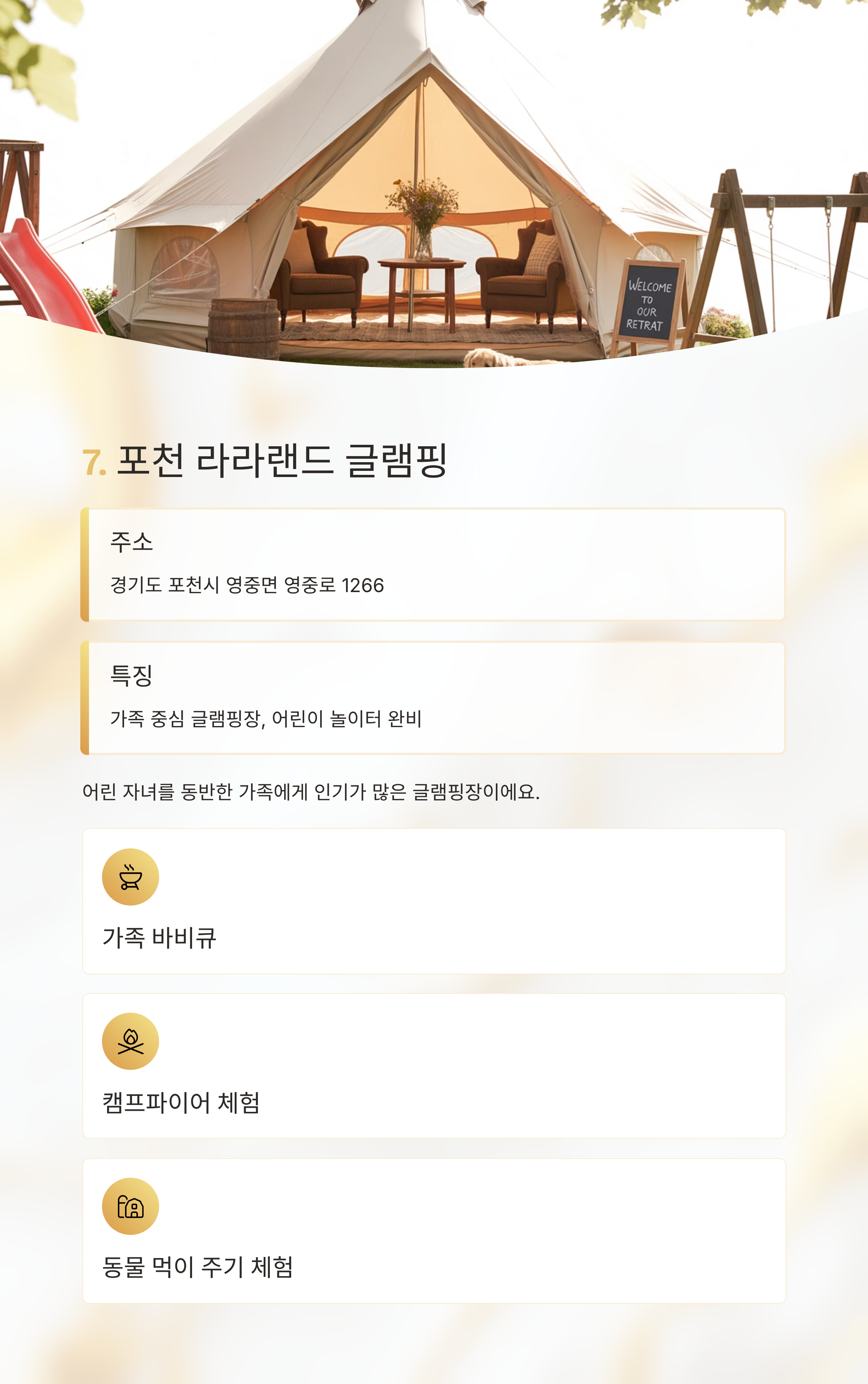 특징 가족 중심 글램핑장, 어린이 놀이터 완비포천 라라랜드는 어린 자녀를 동반한 가족에게 인기가 많은 글램핑장이에요.