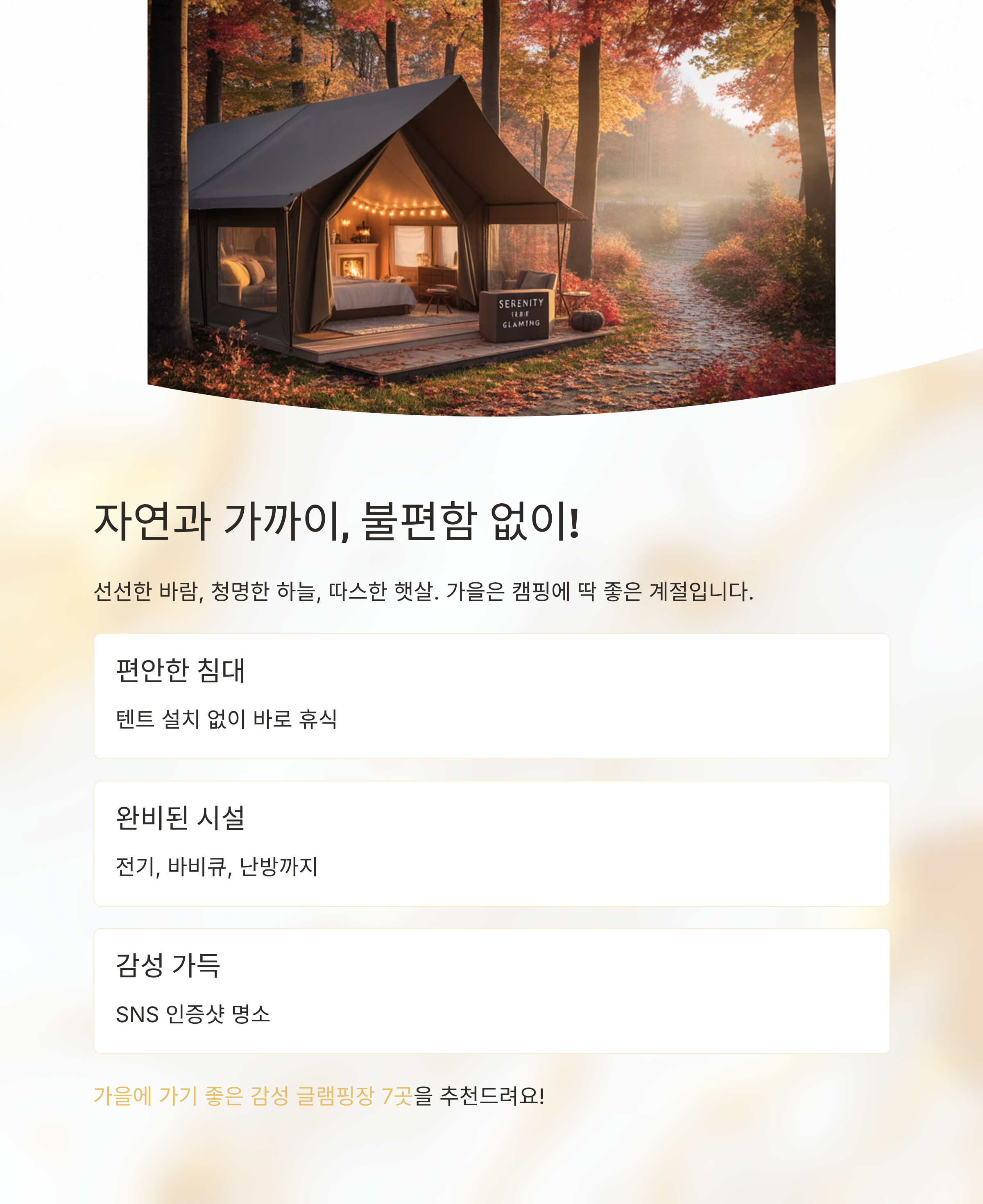 자연과 가까이, 불편함 없이! 가을엔 감성 글램핑이 정답이에요
