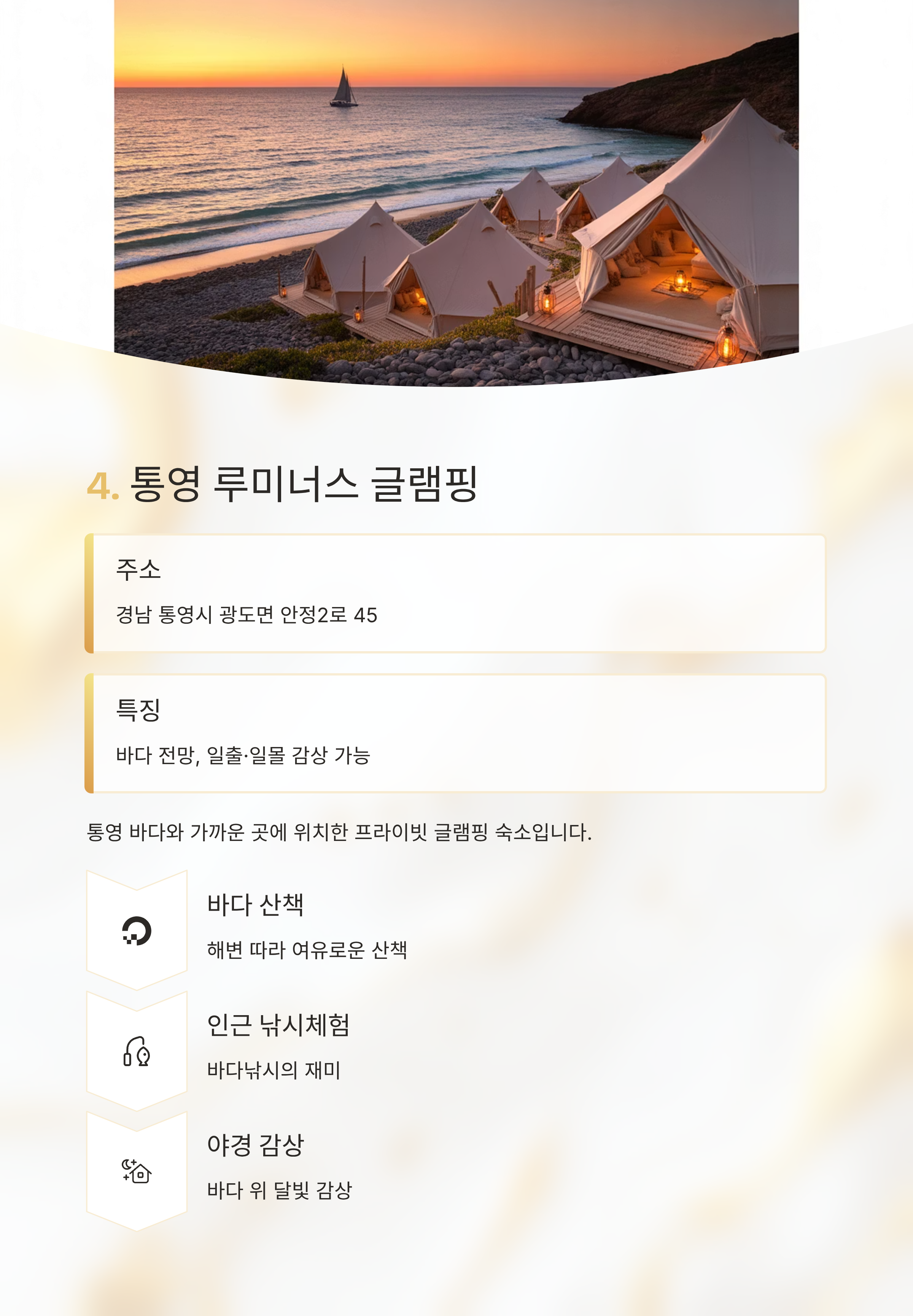 특징 바다 전망, 일출·일몰 감상 가능루미너스글램핑은 실제로 통영 바다와 가까운 곳에 위치한