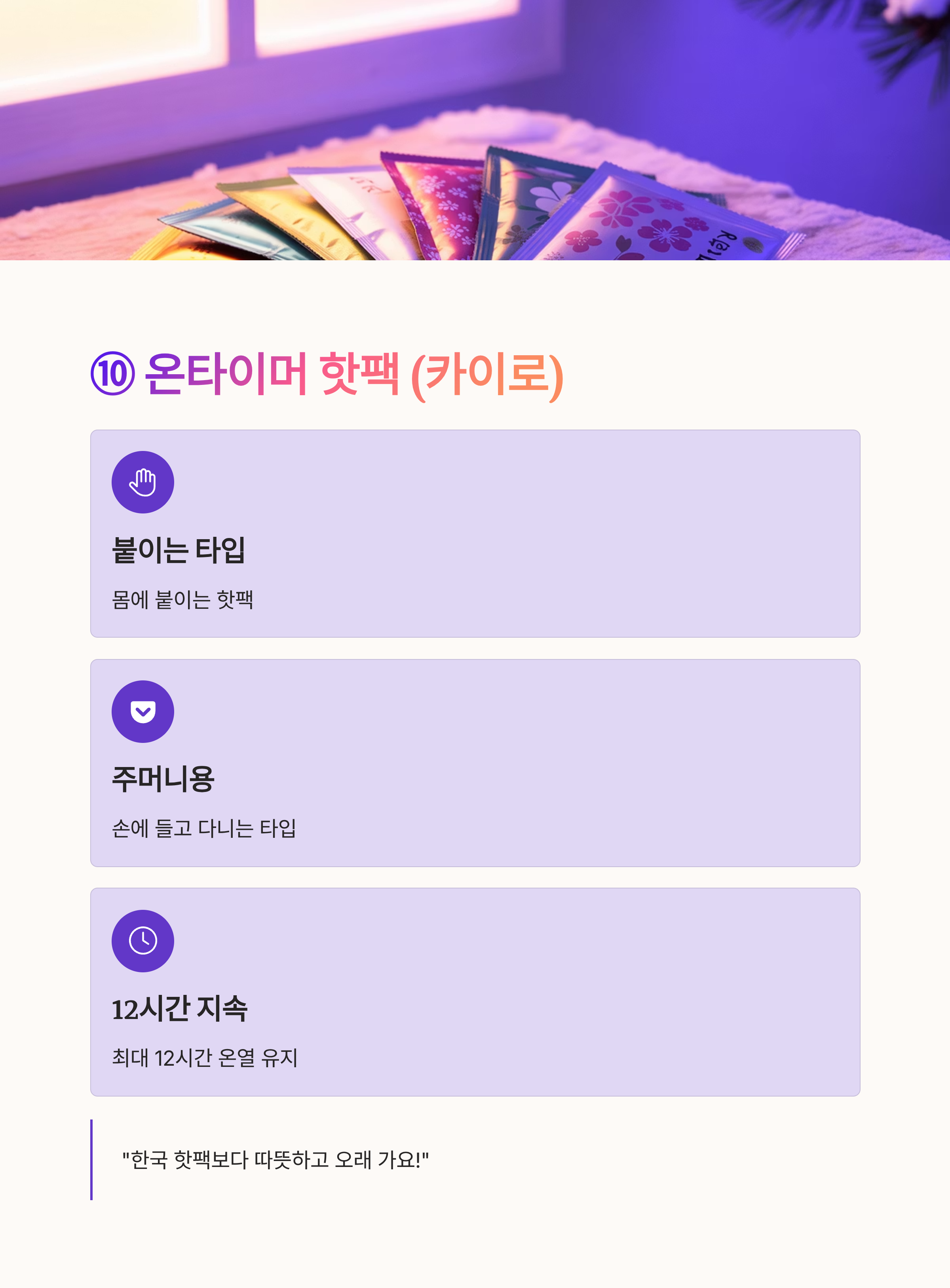 "한국 핫팩보다 따뜻하고 오래 가요. 여행 중에 필수로 들고 다녀요!"※ 일본어 명칭은 '카이로(カイロ)', ‘온타이머’는 브랜드 명