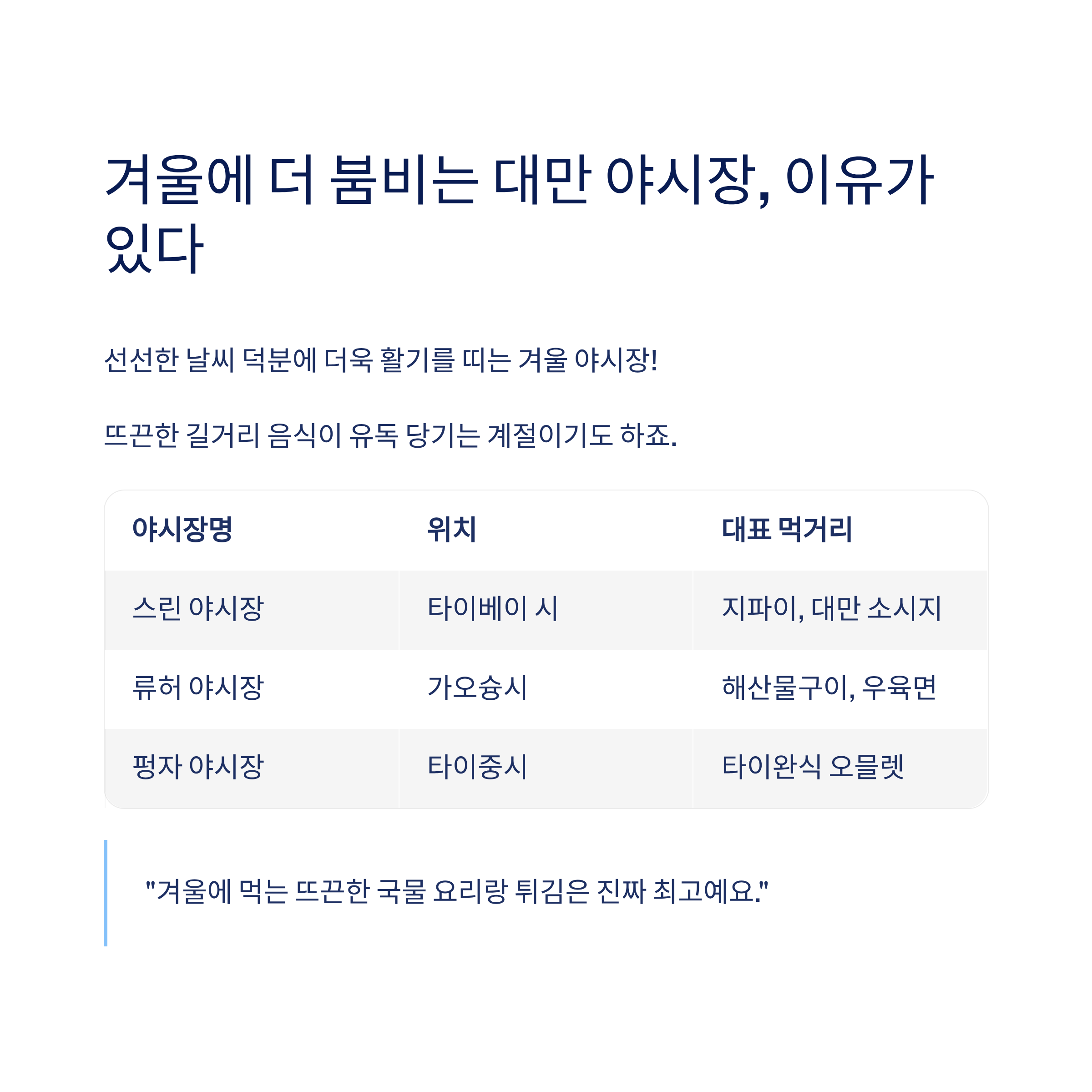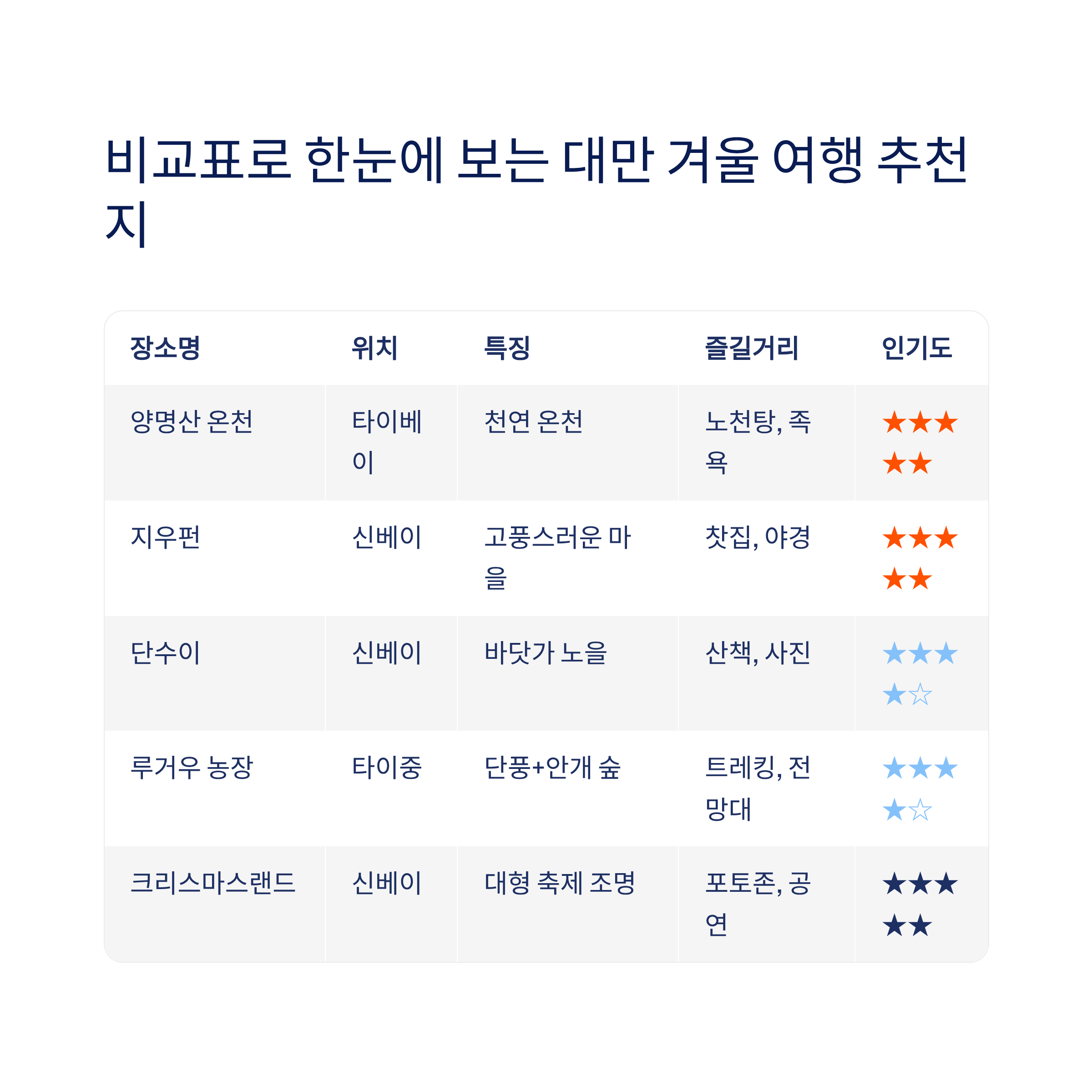비교표로 한눈에 보는 대만 겨울 여행 추천지