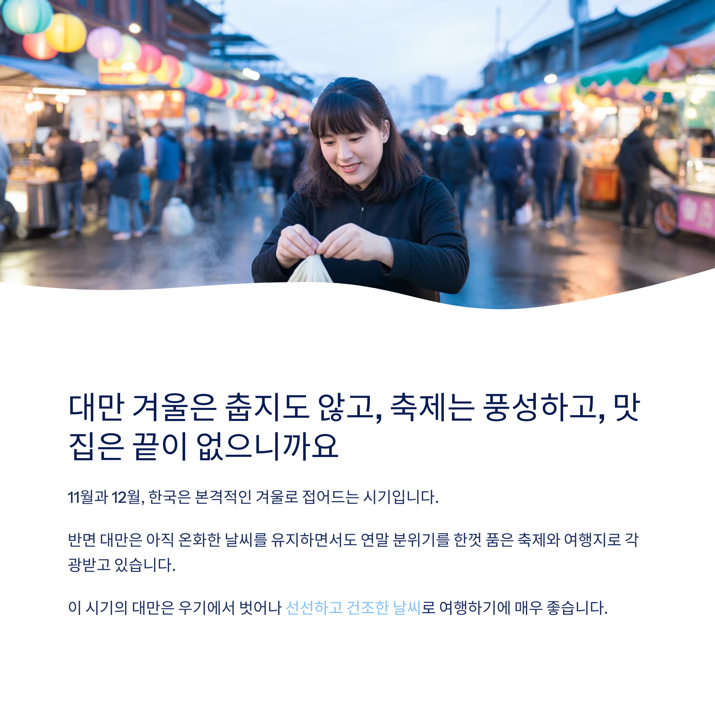 11월과 12월, 한국은 본격적인 겨울로 접어드는 시기입니다. 반면 대만은 아직 온화한 날씨를 유지하면서도 연말 분위기를 한껏 품은 축제와 여행지로 각광받고 있습니다. 이 시기의 대만은 우기에서 벗어나 선선하고 건조한 날씨로 여행하기에 매우 좋습니다. 다양한 지역 축제와 겨울 한정 먹거리, 그리고 인스타그램에 자주 등장하는 야경 명소까지, 매년 이맘때 많은 여행자들이 몰리는 이유가 분명해집니다.