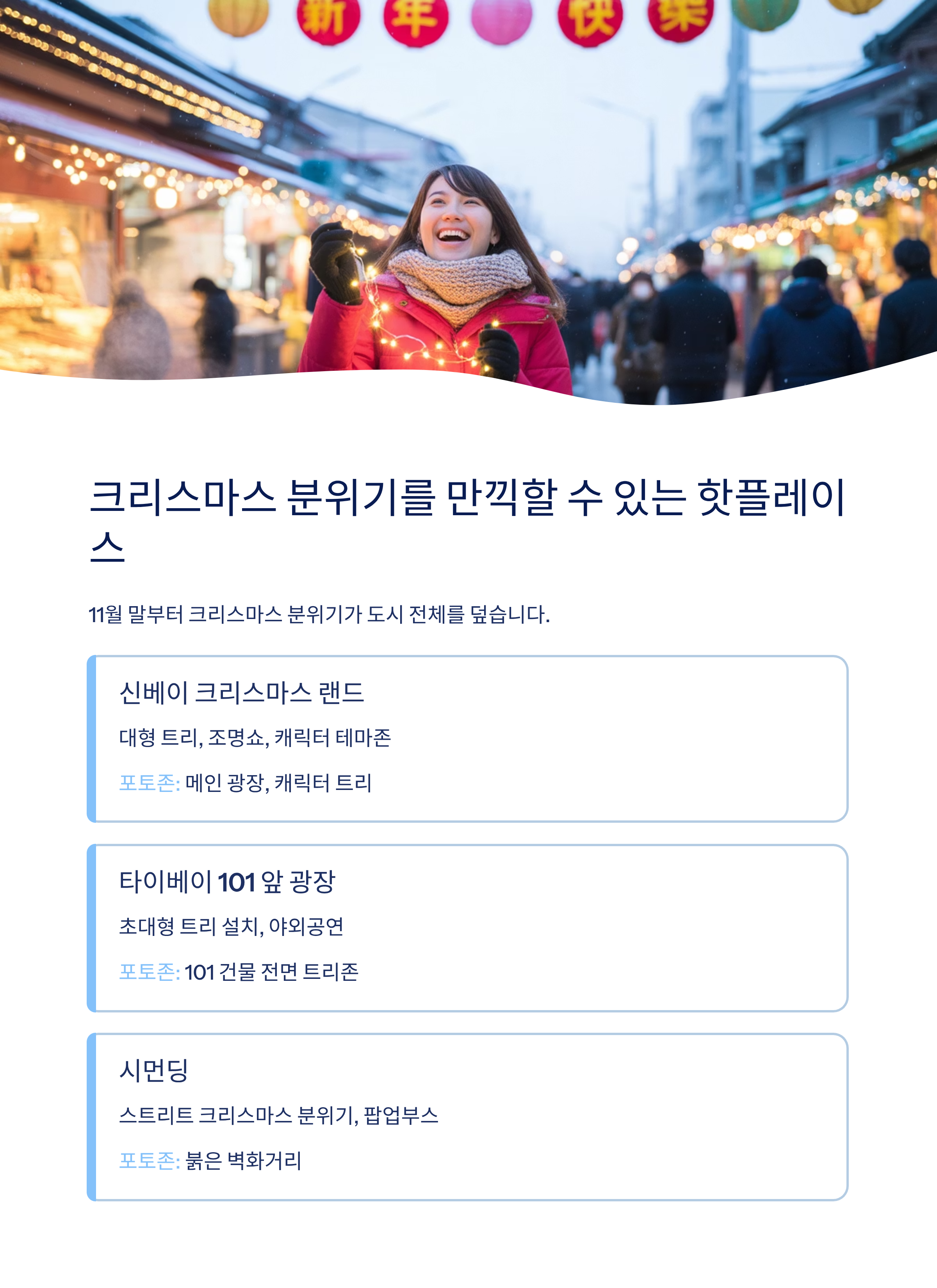신베이 크리스마스 랜드 신베이시 반차오구 시청광장 대형 트리, 대형 전광판 조명쇼, 캐릭터 테마존 메인 광장, 캐릭터 트리 타이베이 101 앞 광장 타이베이 시 신이구 초대형 트리 설치, 조명장식, 야외공연 101 건물 전면 트리존 시먼딩 타이베이 시 완화구 스트리트 크리스마스 분위기, 팝업부스 붉은 벽화거리, 거리 조명존 여행자 후기 요약