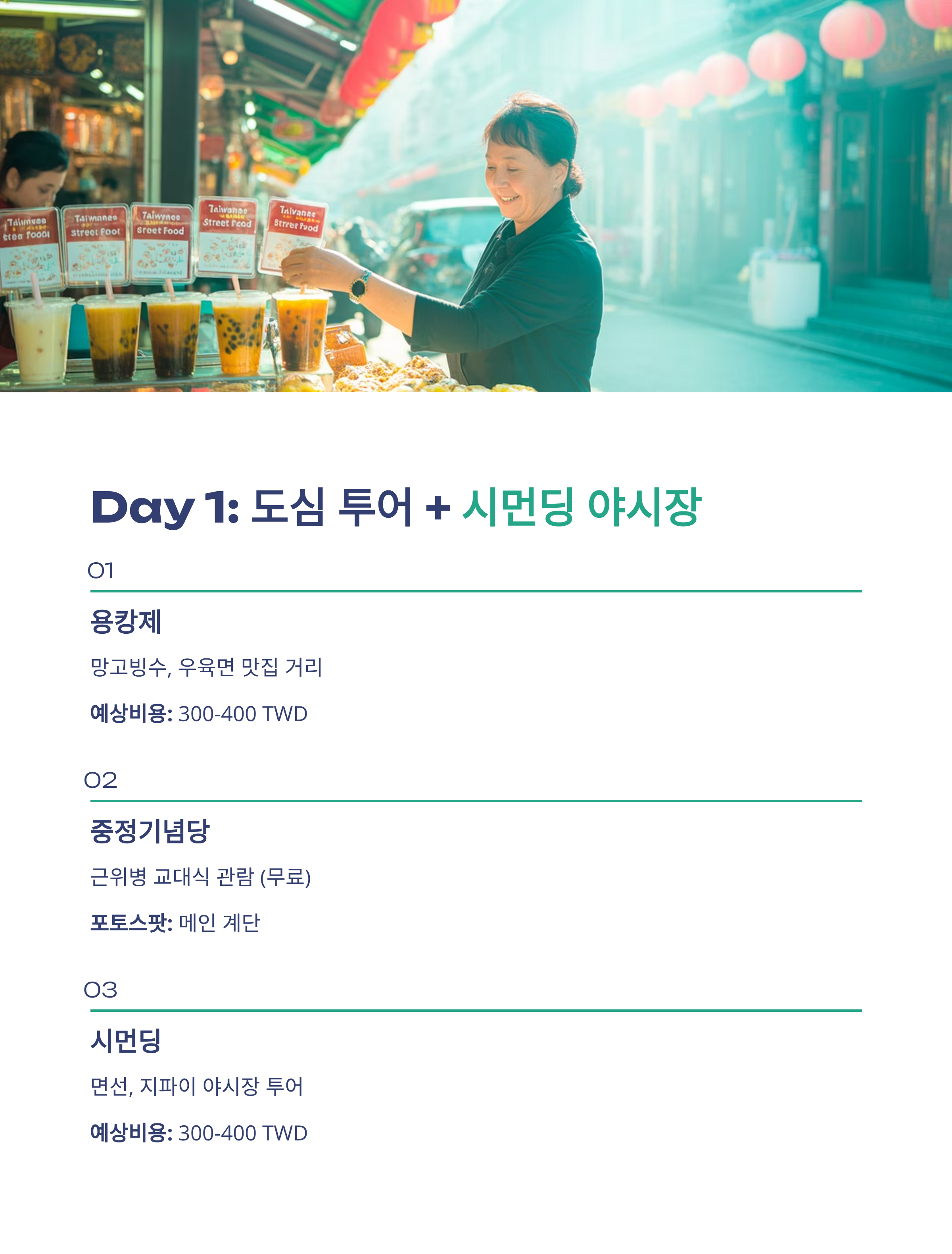 - 예상비용: 간식+저녁 약 300~400 TWD