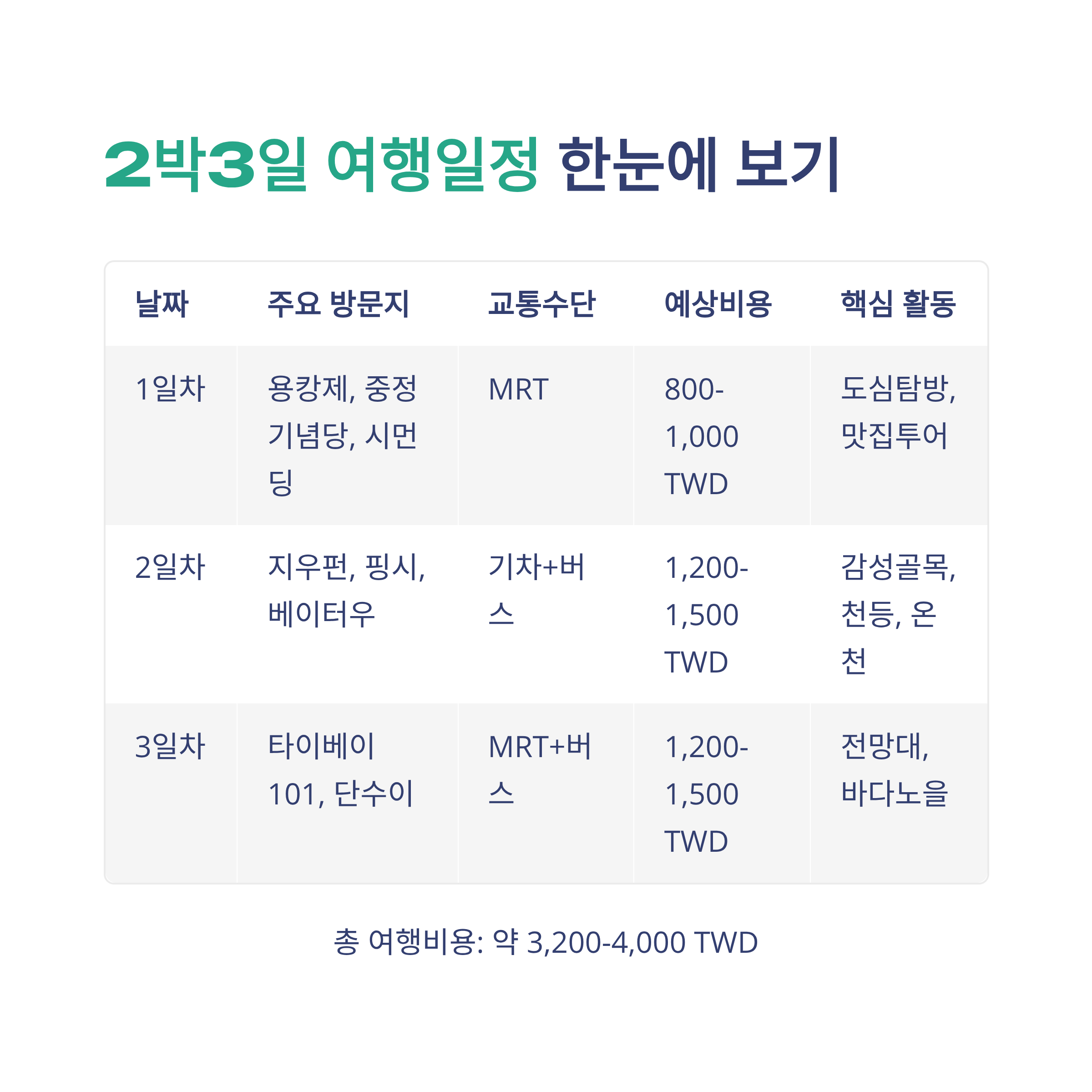 1일차 용캉제, 중정기념당, 시먼딩 MRT 약 800~1,000 도심 탐방, 맛집 투어 2일차 지우펀, 핑시, 베이터우 기차+버스+MRT 약 1,200~1,500 감성 골목, 천등 체험, 온천 힐링 3일차 타이베이101, 단수이 MRT+버스 약 1,200~1,500 전망대 관람, 바다 노을 산책