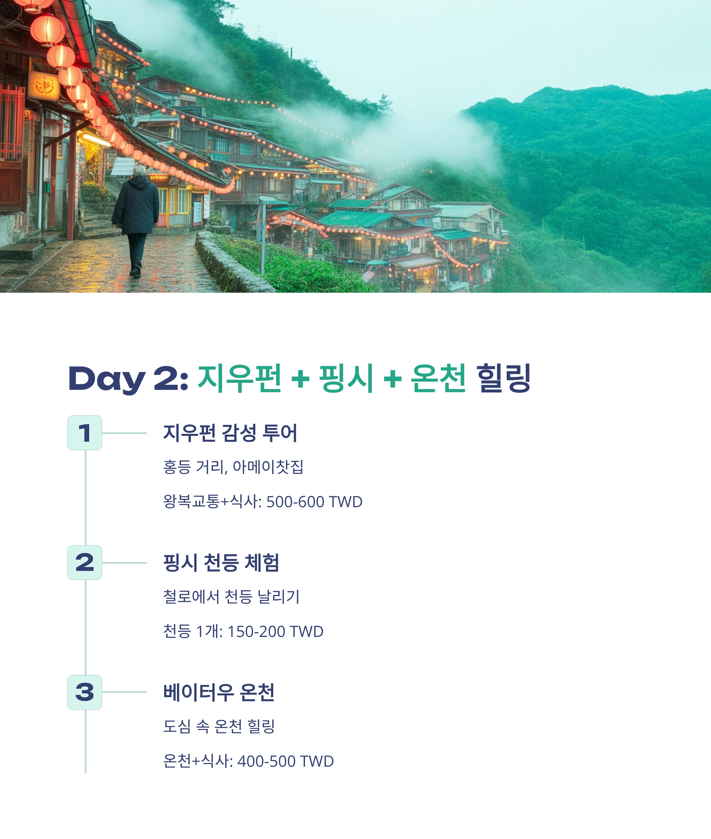 - 예상비용: 왕복 교통+식사 약 500~600 TWD