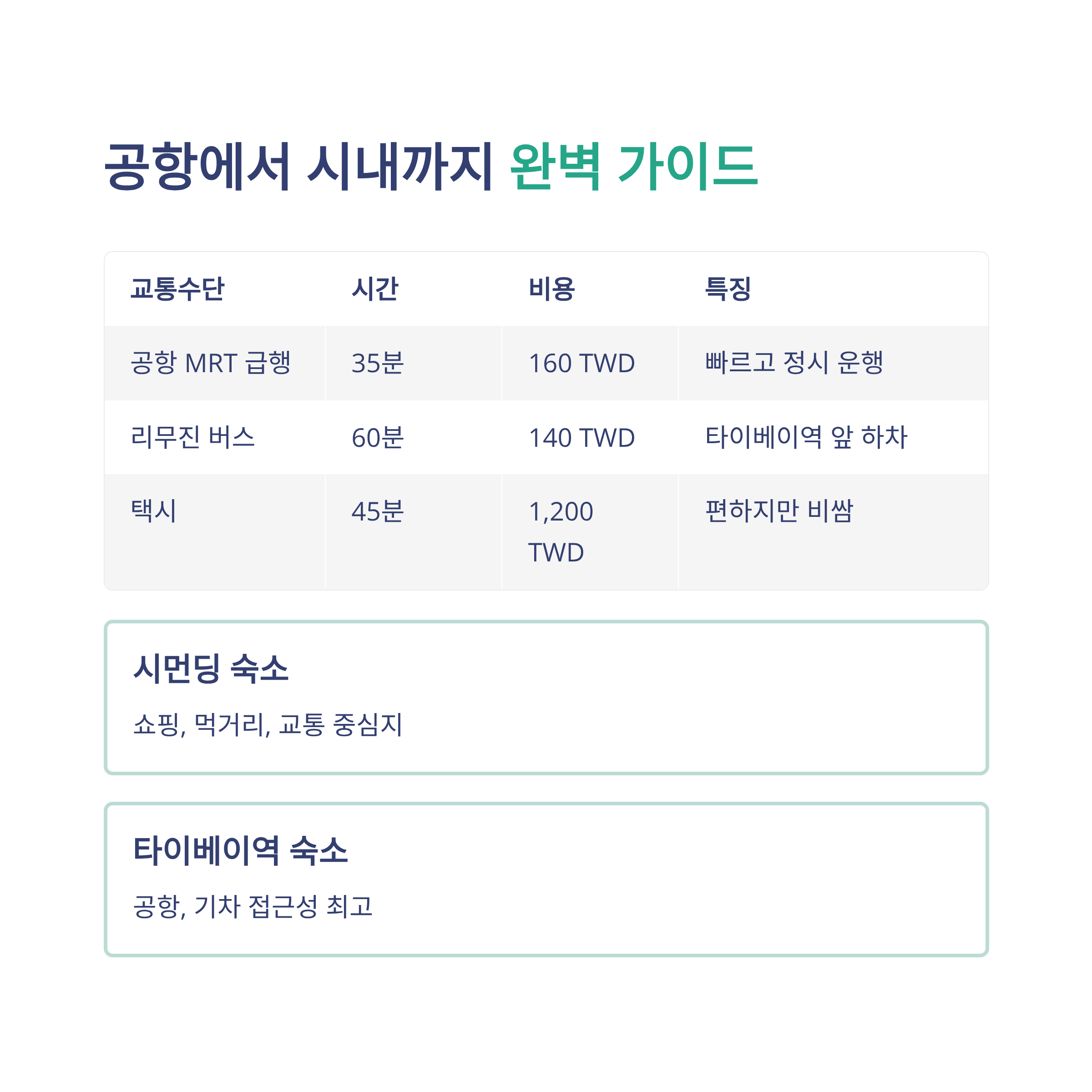 공항 MRT (급행) 약 35분 160 TWD 빠르고 정시 운행 공항 MRT (일반) 약 50분 130 TWD 정차역 많음 리무진 버스 약 60분 140 TWD 타이베이역 앞 하차 택시 약 45~60분 약 1,000~1,200 TWD 편하지만 비쌈 추천 숙소 지역