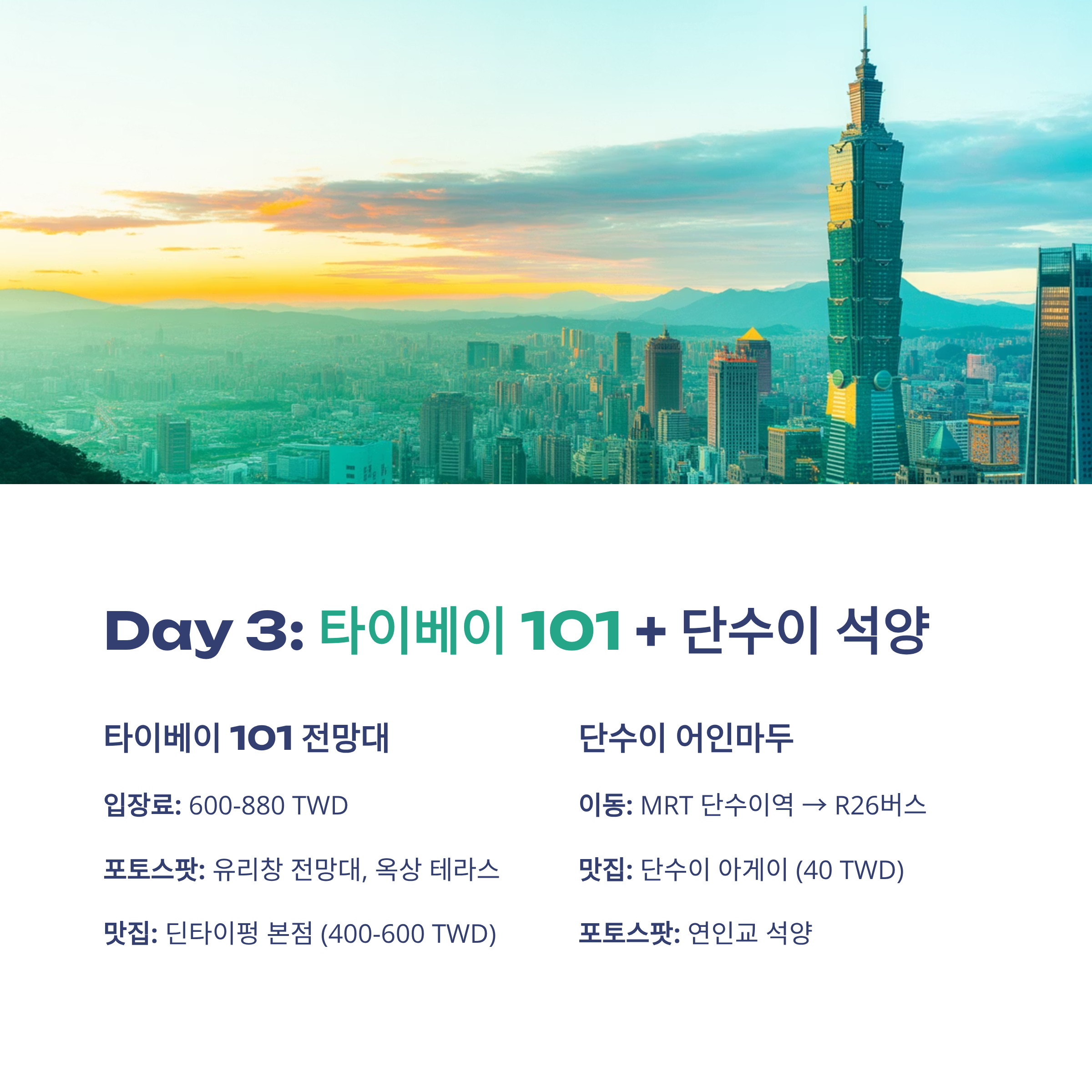 용캉제 타이베이 로컬 감성 거리 망고빙수, 우육면 300~400 TWD 시먼딩 타이베이 쇼핑, 야시장 면선, 지파이 300~400 TWD 지우펀 신베이 감성 홍등 거리 찻집, 타로볼 500~600 TWD 핑시 신베이 천등 날리기 기차역 주변 간식 200~300 TWD 베이터우 타이베이 도심 온천 딤섬, 족욕탕 400~500 TWD 타이베이101 타이베이 고층 전망대 딘타이펑 800~1,000 TWD 단수이 신베이 바닷가 석양 아게이, 어묵탕 300~400 TWD