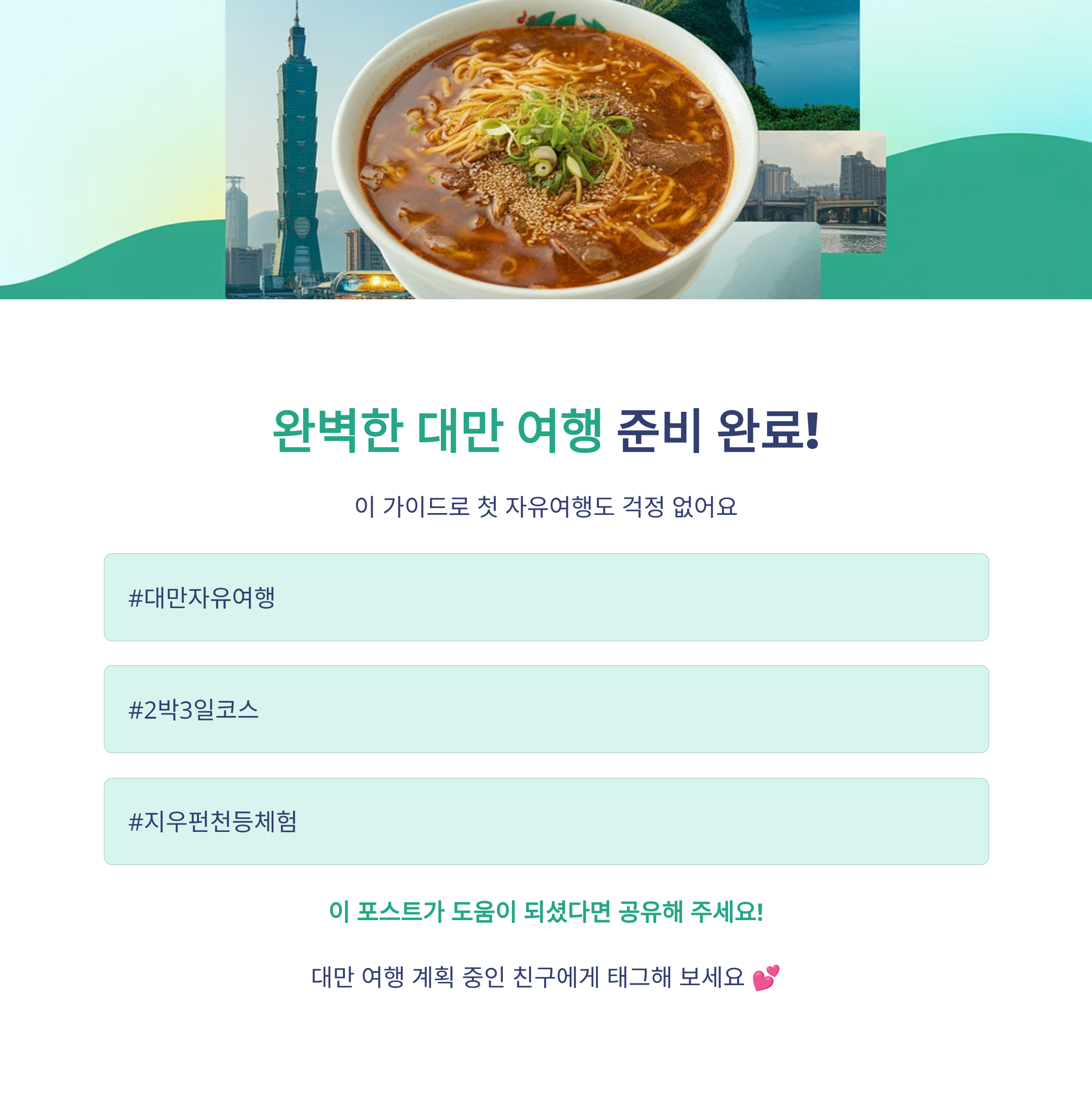 MRT, 기차, 버스 등 교통망이 잘 정비되어 있어 초행길이라도 어렵지 않습니다.이번 글에서는 정확한 이동 수단, 실제 여행 비용, 입장료, 추천 맛집, SNS 인기 포토스팟까지 모두 포함한 대만 2박 3일 자유여행 가이드를 알려드립니다.