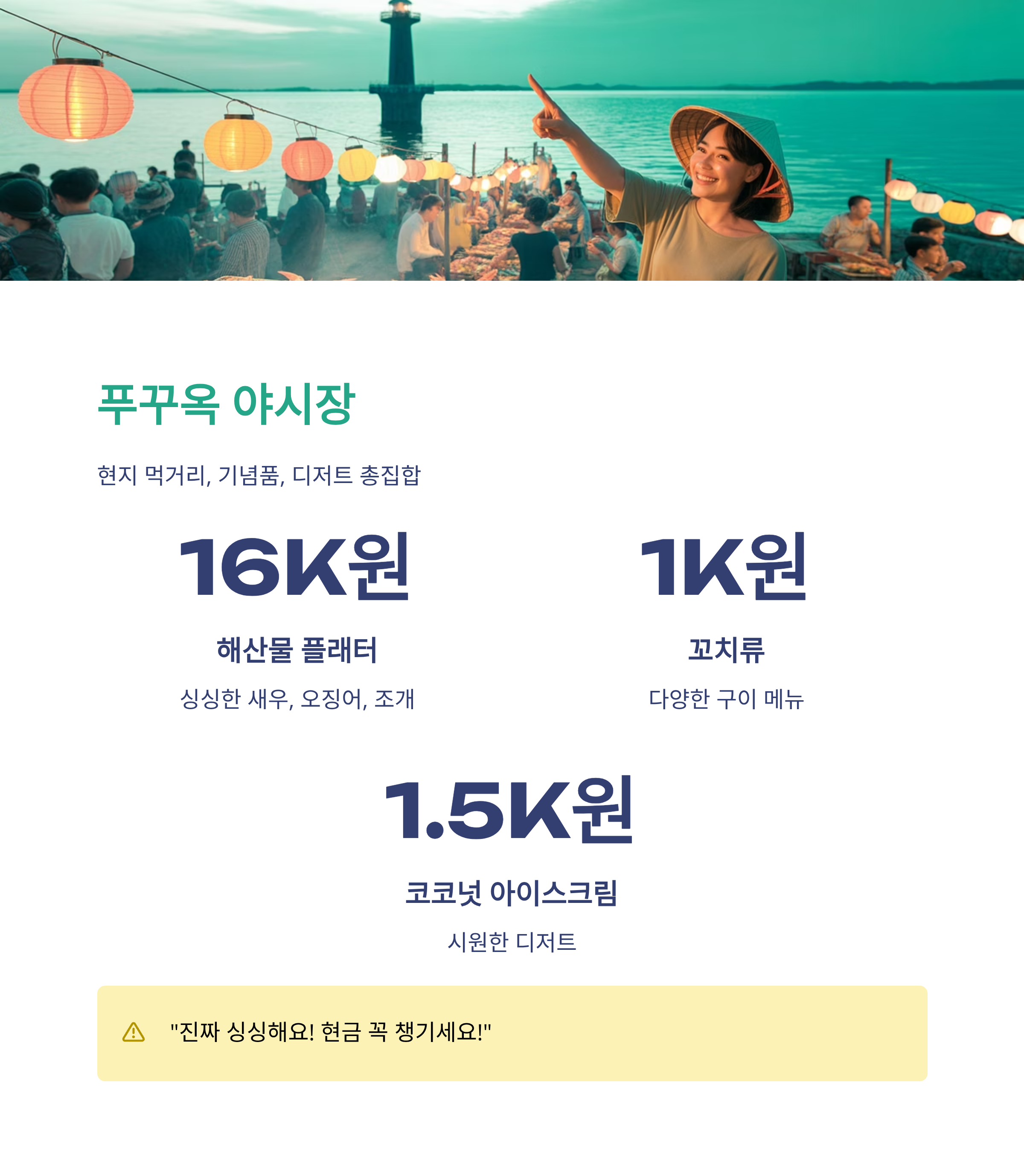 "진짜 싱싱해요. 새우, 오징어, 조개 다 너무 맛있고 저렴해요. 현금 꼭 챙기세요!"