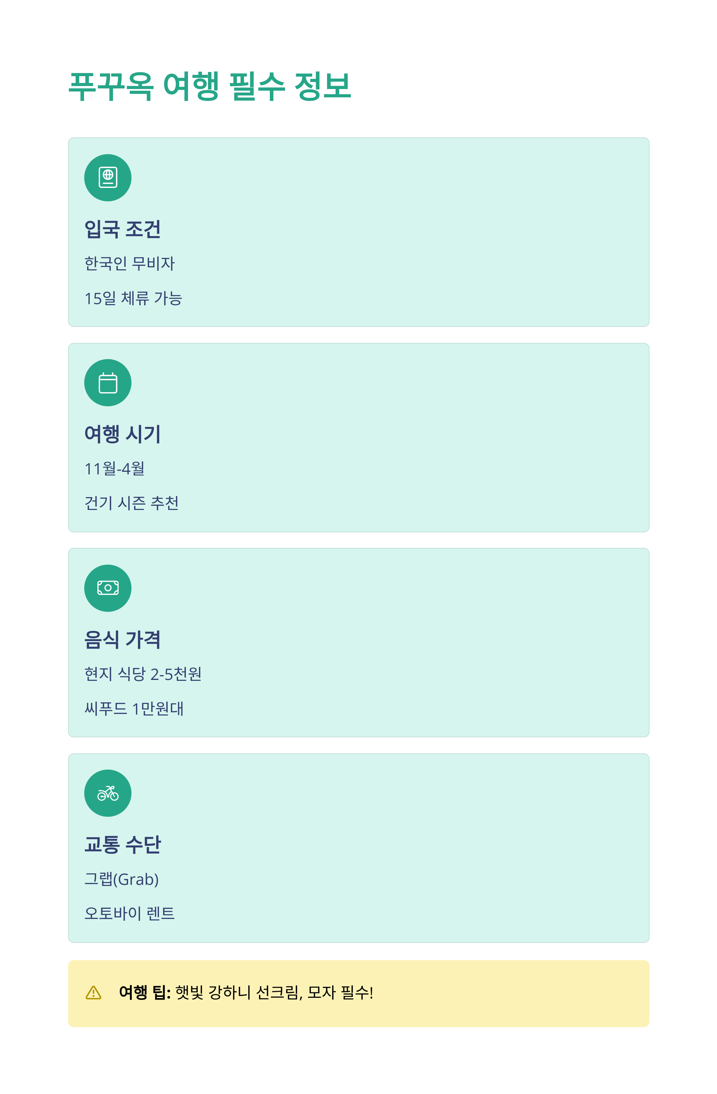 입국 조건 한국인 무비자 15일 체류 가능 여행 시기 11월~4월 건기 시즌 추천 음식 가격 현지 식당 2~5천 원, 씨푸드 1만 원대 교통 수단 그랩(Grab), 오토바이 렌트 추천 여행 팁 햇빛 강하니 선크림, 모자 필수!