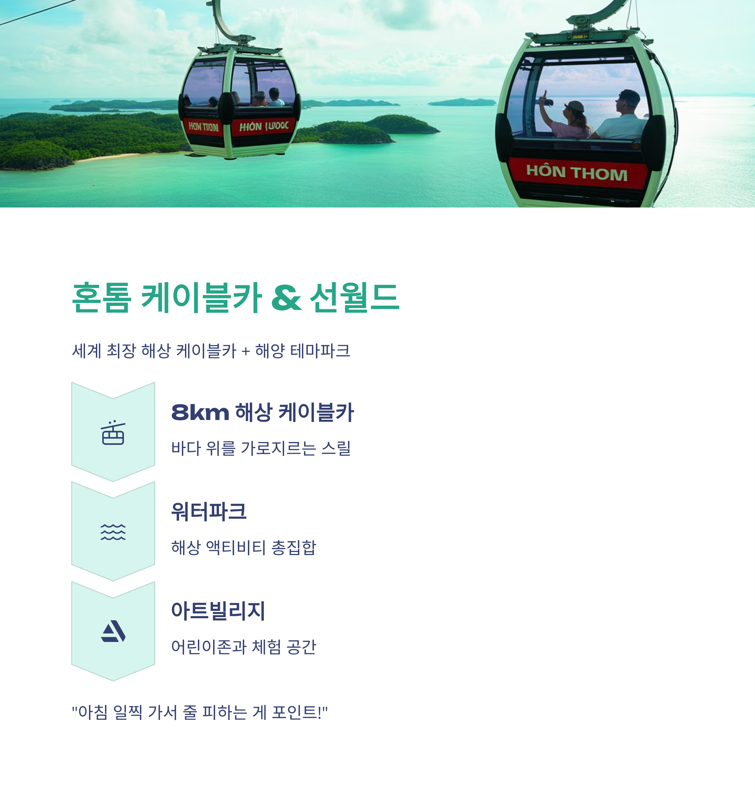 "케이블카 타면서 바다 건너는 그 느낌이 최고예요. 다만 줄이 길 수 있으니 아침 일찍 가는 걸 추천!"