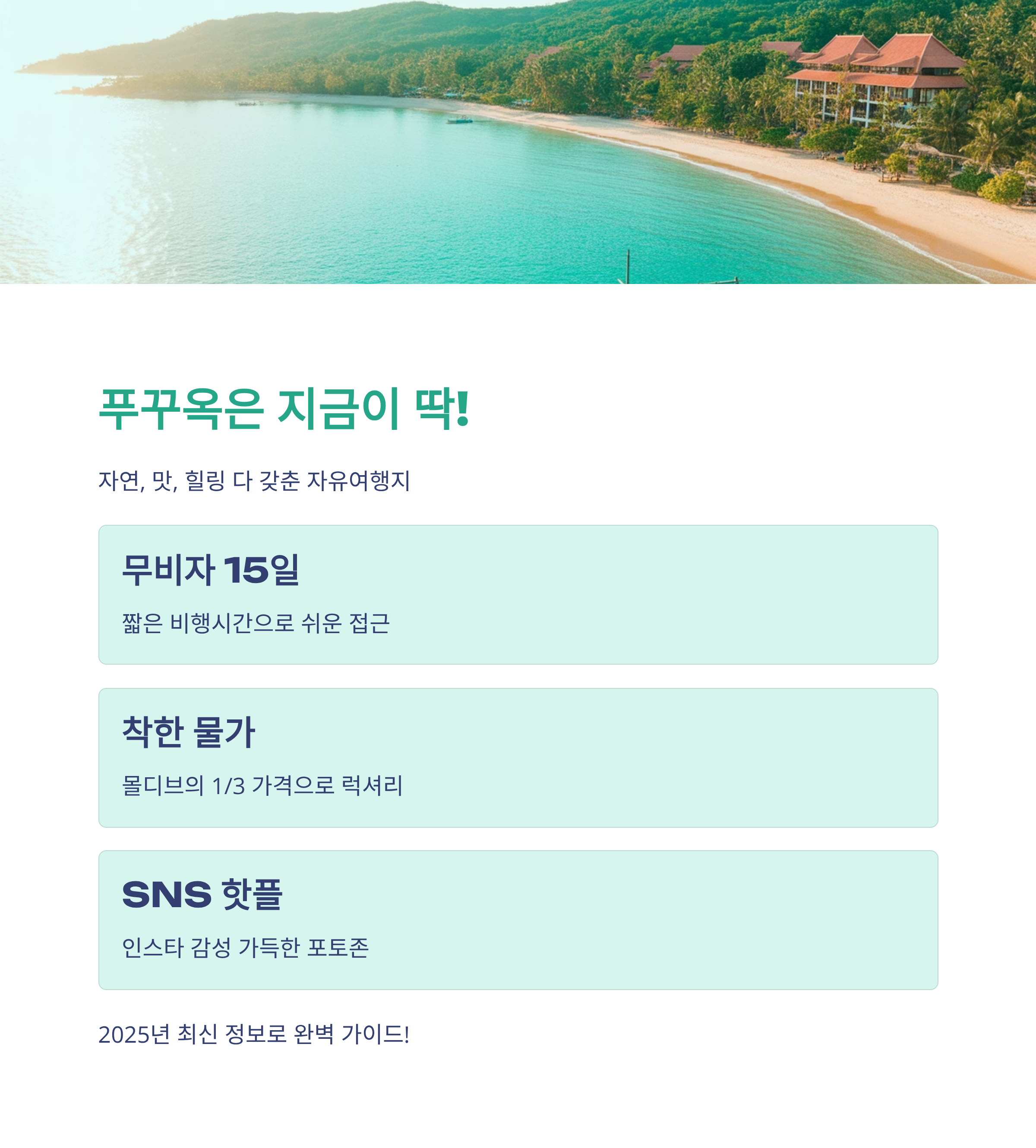 2025년 기준 최신 정보와 SNS 인기 스팟 위주로, 푸꾸옥의 추천 여행지, 맛집, 포토존, 실후기, 여행 루트 요약표까지 한번에 정리해드릴게요.