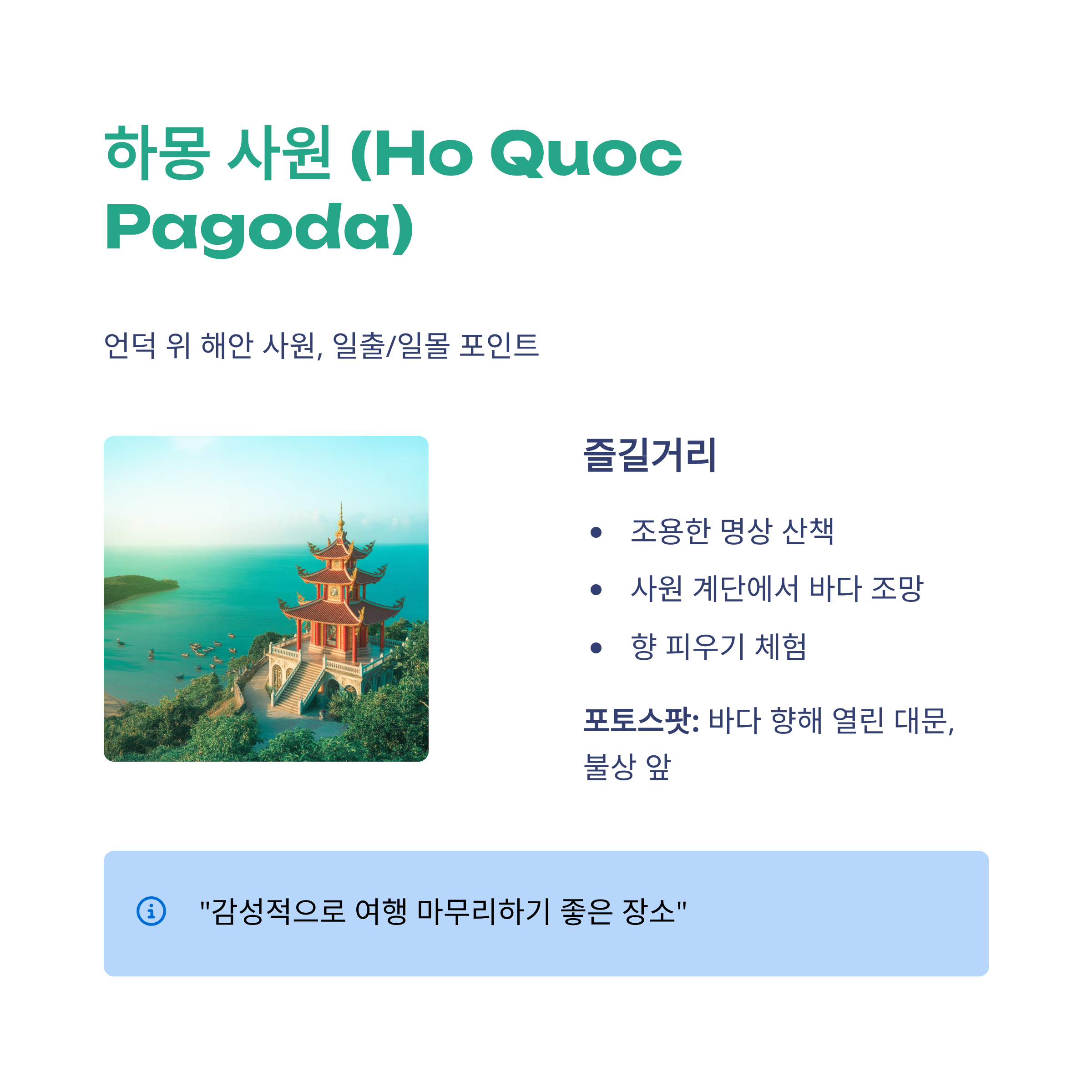 "사찰인데도 사진 욕심 나요. 조용해서 감성적으로 여행 마무리하기 좋은 장소예요."