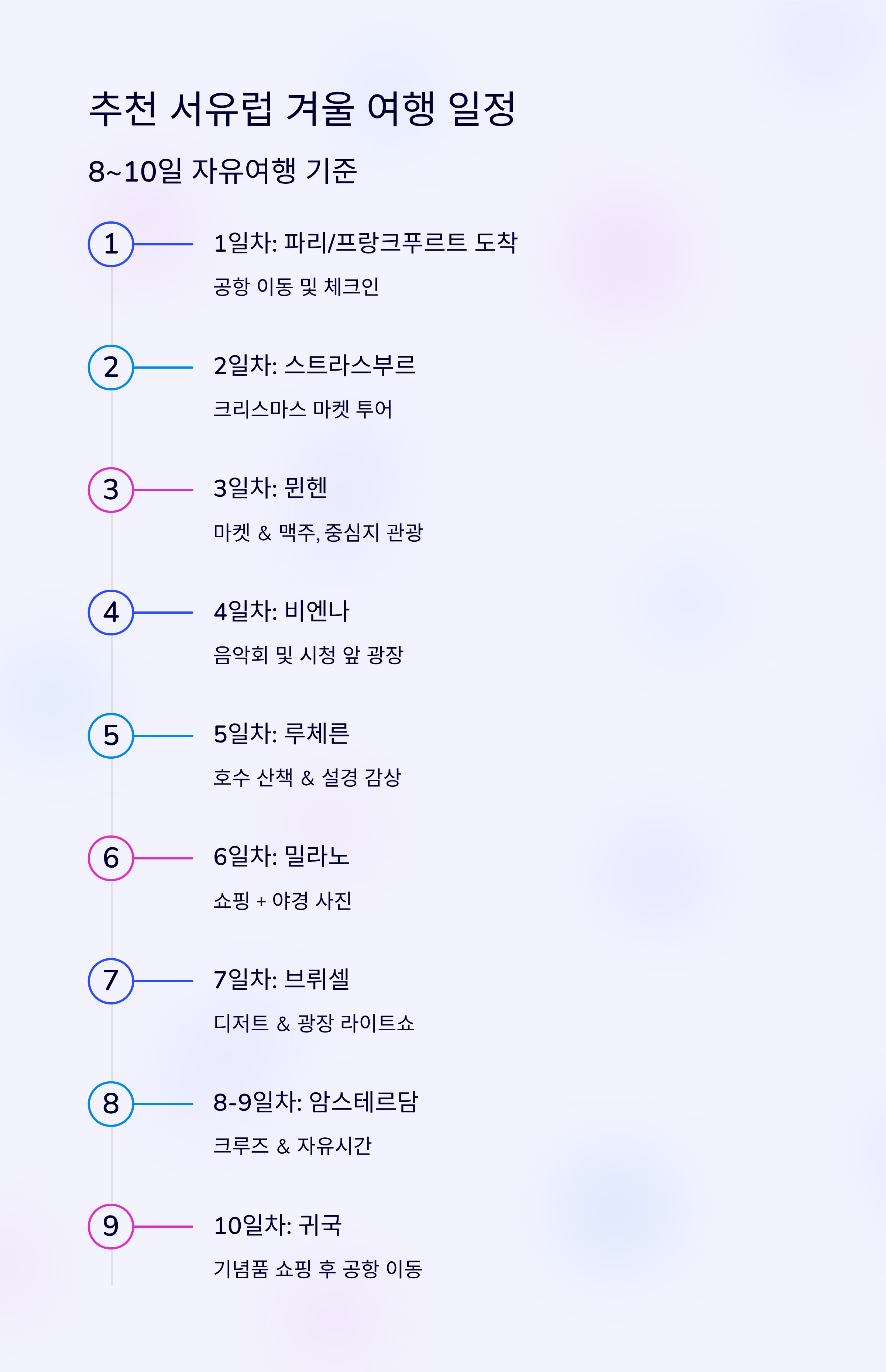1일차 파리 or 프랑크푸르트 도착 공항 이동 / 체크인 2일차 스트라스부르 크리스마스 마켓 투어 3일차 뮌헨 마켓 & 맥주, 중심지 관광 4일차 비엔나 음악회 or 시청 앞 광장 5일차 루체른 호수 산책 & 설경 감상 6일차 밀라노 쇼핑 + 야경 사진 7일차 브뤼셀 디저트 & 광장 라이트쇼 8~9일차 암스테르담 크루즈 & 자유시간 10일차 귀국 기념품 쇼핑 후 공항 이동