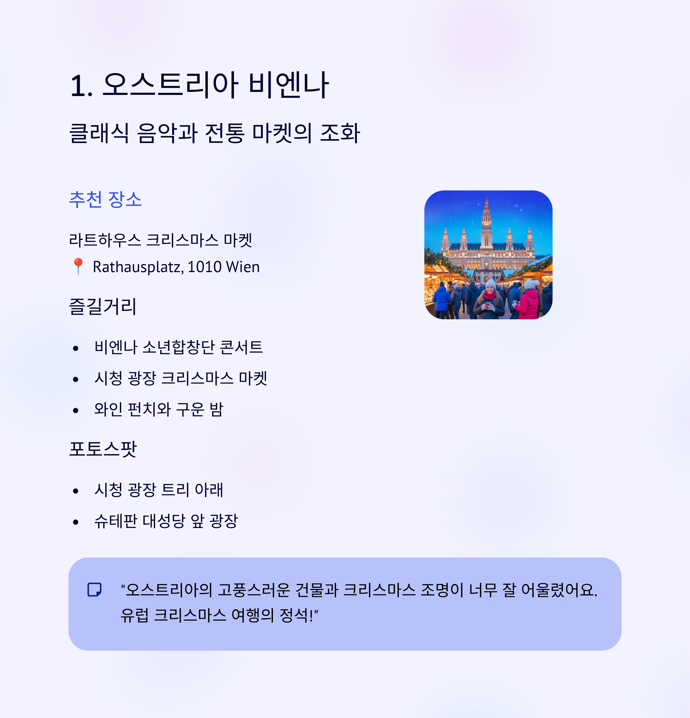 "오스트리아의 고풍스러운 건물과 크리스마스 조명이 너무 잘 어울렸어요. 단연코 유럽 크리스마스 여행의 정석 같은 도시였습니다."