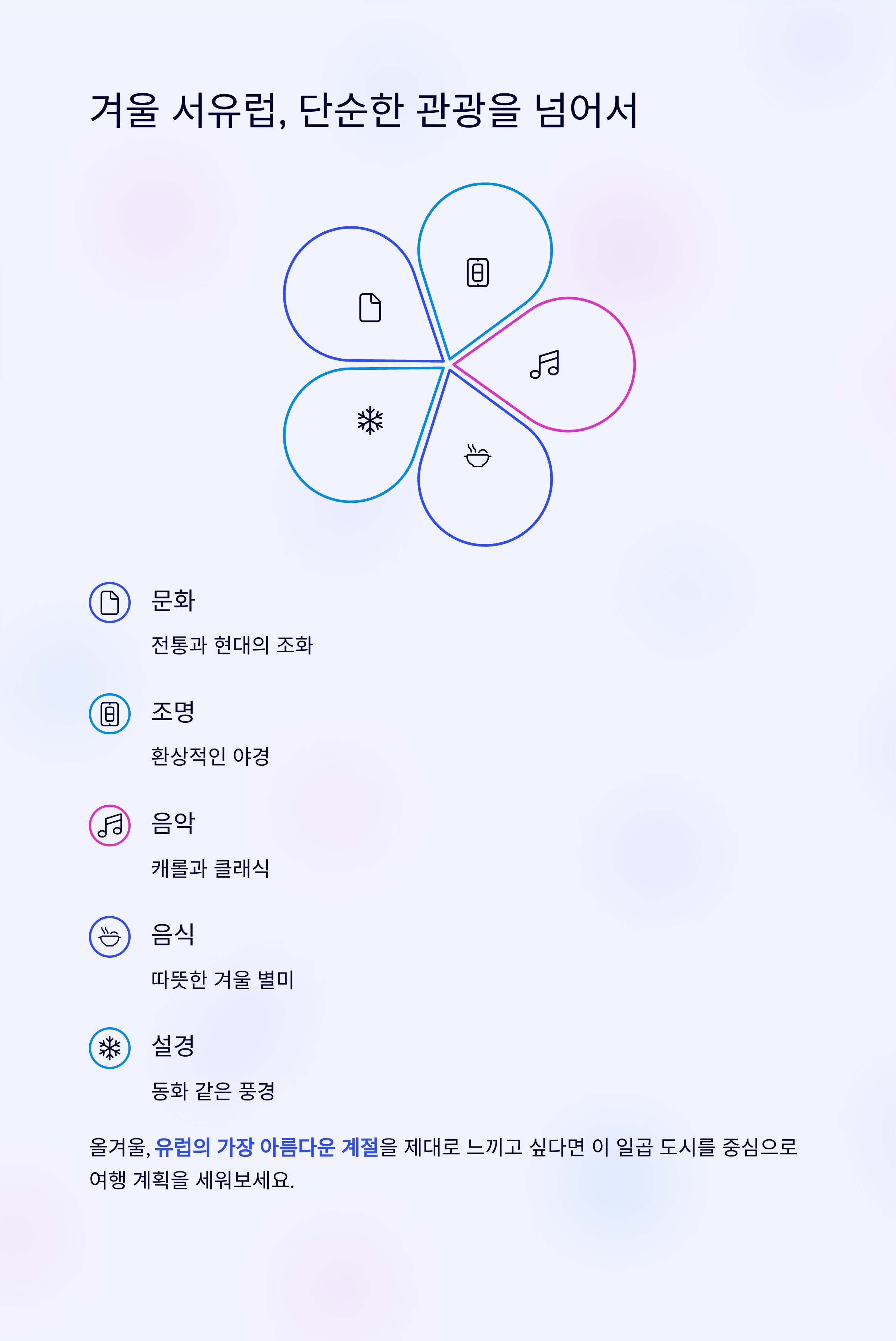 문화, 조명, 음악, 음식, 설경이 어우러지는 종합적인 감성 여행입니다.