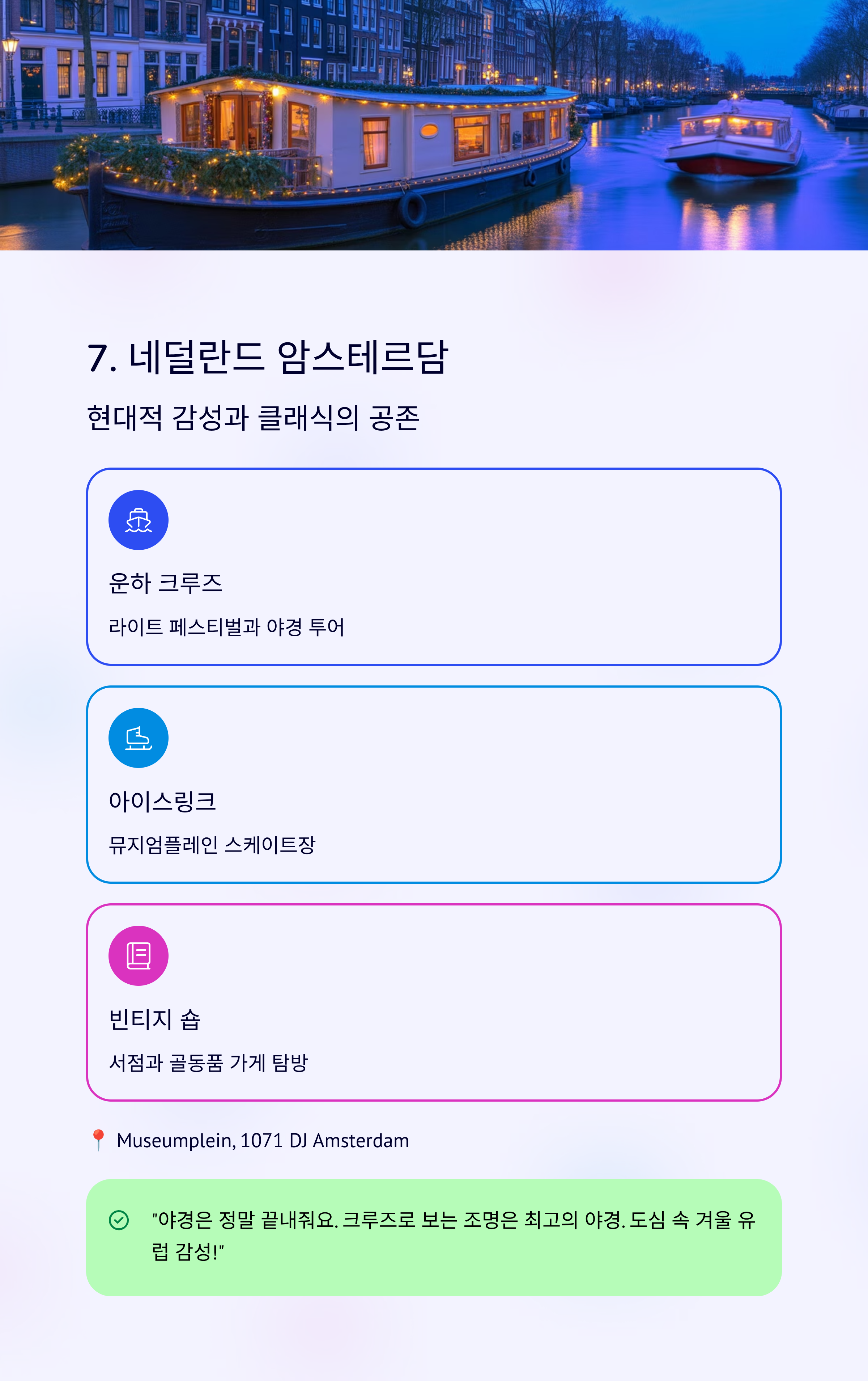 "야경은 정말 끝내줘요. 크루즈 타며 보는 조명은 여태 본 야경 중 최고. 도심 속 겨울 유럽 감성 최고입니다."