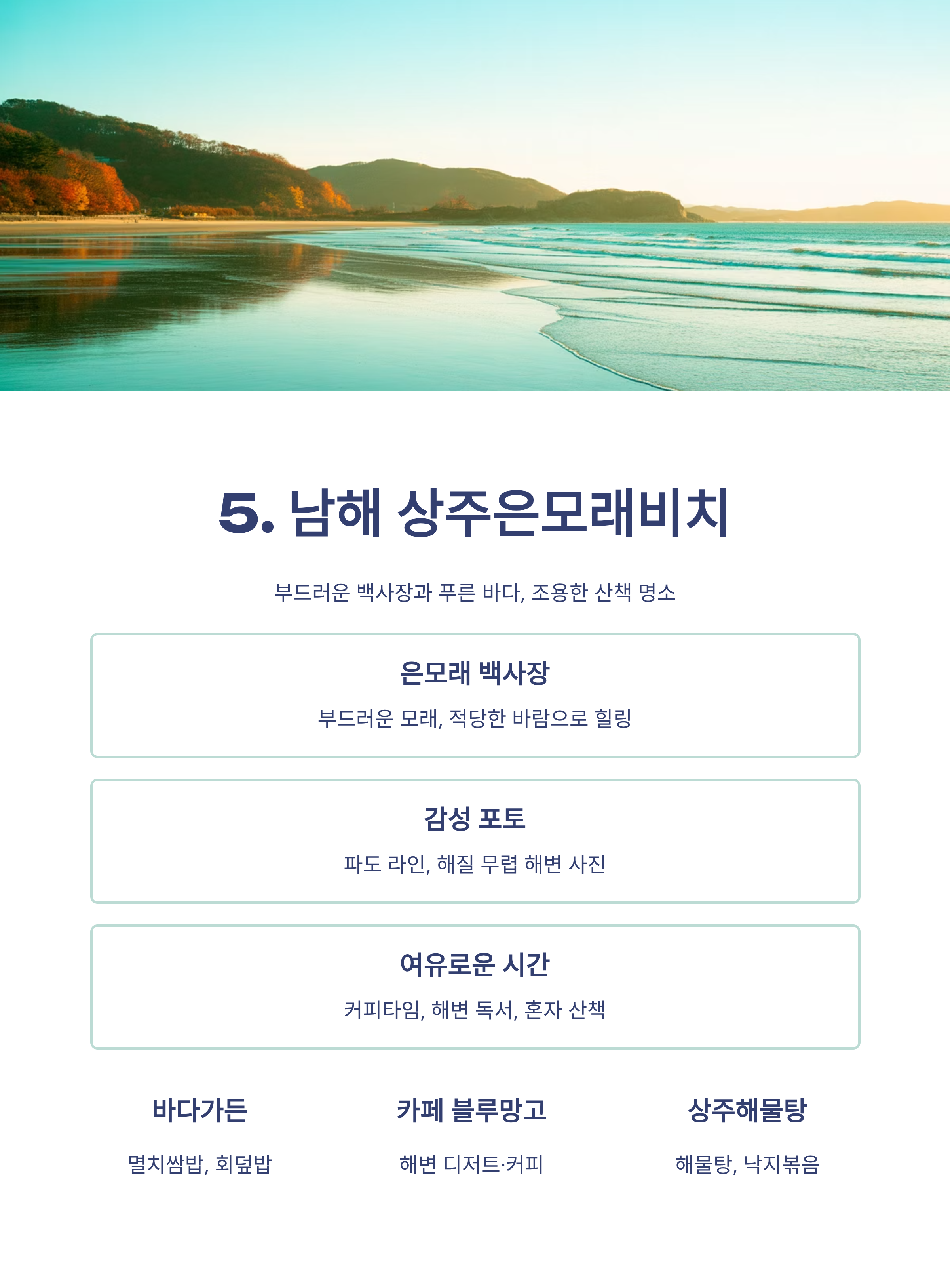 남해는 늦가을에도 따뜻한 햇살과 잔잔한 바다를 품고 있는 감성 여행지입니다. 북쪽에서 단풍이 다 지고 찬바람이 불기 시작할 즈음, 남해는 여전히 온화한 날씨와 한적한 분위기로 여행자들을 맞이하죠. 이번 글에서는 SNS에서 꾸준히 언급되는 남해의 감성 명소 5곳과 함께, 각 장소별 맛집 3곳씩을 엄선해 소개합니다. 직접 체험한 듯한 후기와 주소, 포토스팟, 즐길 거리까지 모두 포함했고, 내용은 2024~2025년 기준 최신 정보를 기반으로 사실 여부를 재검토해 구성했습니다.