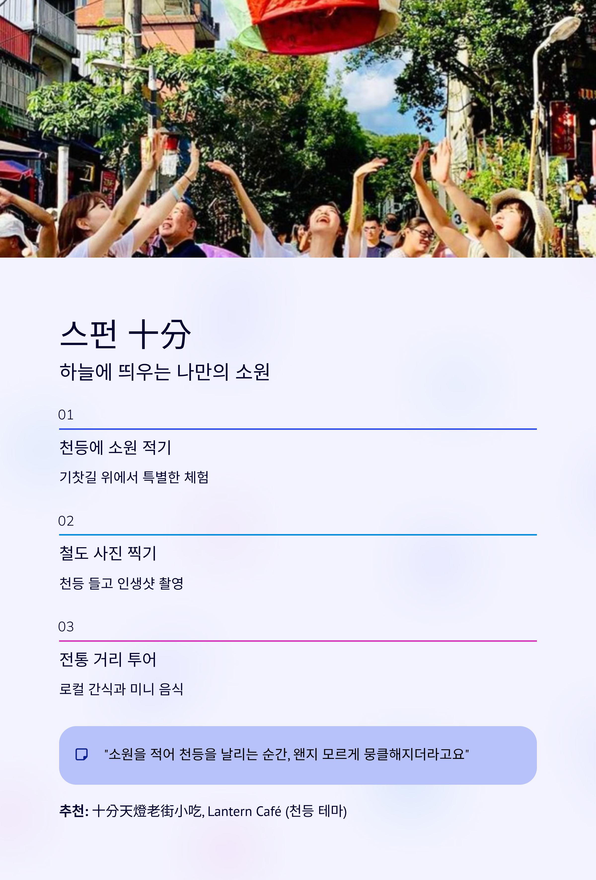"소원을 적어 천등을 날리는 순간, 왠지 모르게 뭉클해지더라고요. 아이들도 너무 좋아했어요."추천 맛집/카페