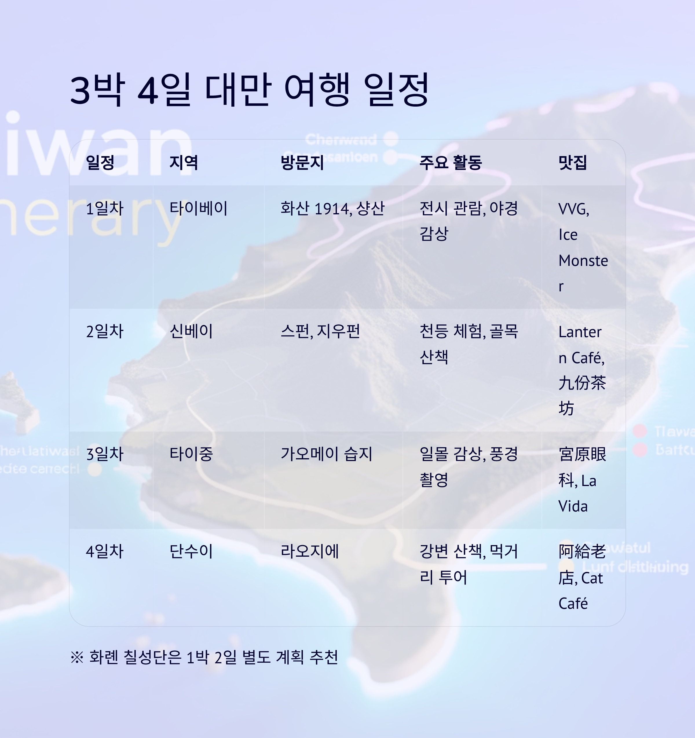 1일차 타이베이 시내 화산 1914, 샹산 전시 관람, 야경 감상 VVG Something, Ice Monster 2일차 신베이 스펀, 지우펀 천등 체험, 골목 산책 Lantern Café, Jiufen Teahouse 3일차 타이중 가오메이 습지 일몰 감상, 풍경 촬영 Miyahara, La Vida Café 4일차 단수이 → 공항 단수이 라오지에 강변 산책, 먹거리 투어 阿給老店, Tamsui Cat Café ※ 화롄 칠성단 해변은 일정 여유가 있다면 1박 2일로 따로 계획하는 것을 추천드립니다.