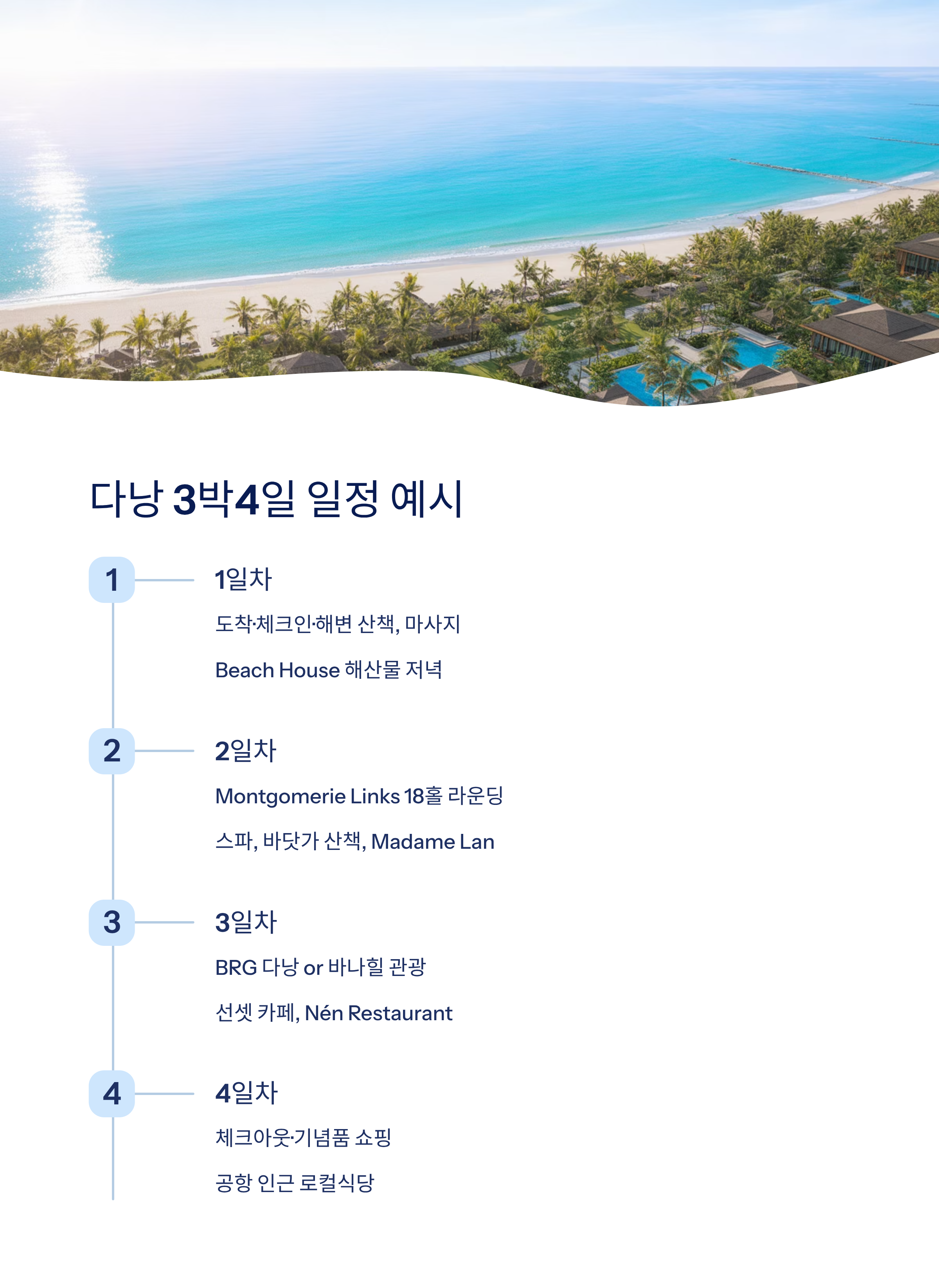 1일차 도착·체크인·해변 산책 없음 마사지, 해산물 저녁 Beach House, 43 Factory 2일차 18홀 라운딩 → 오후 휴식 Montgomerie Links 스파, 바닷가 산책 Madame Lan 3일차 라운딩 or 관광 (선택) BRG Da Nang or 바나힐 마사지, 선셋 카페 Nén Restaurant 4일차 체크아웃 → 기념품 쇼핑 없음 간단한 마사지 공항 인근 로컬식당