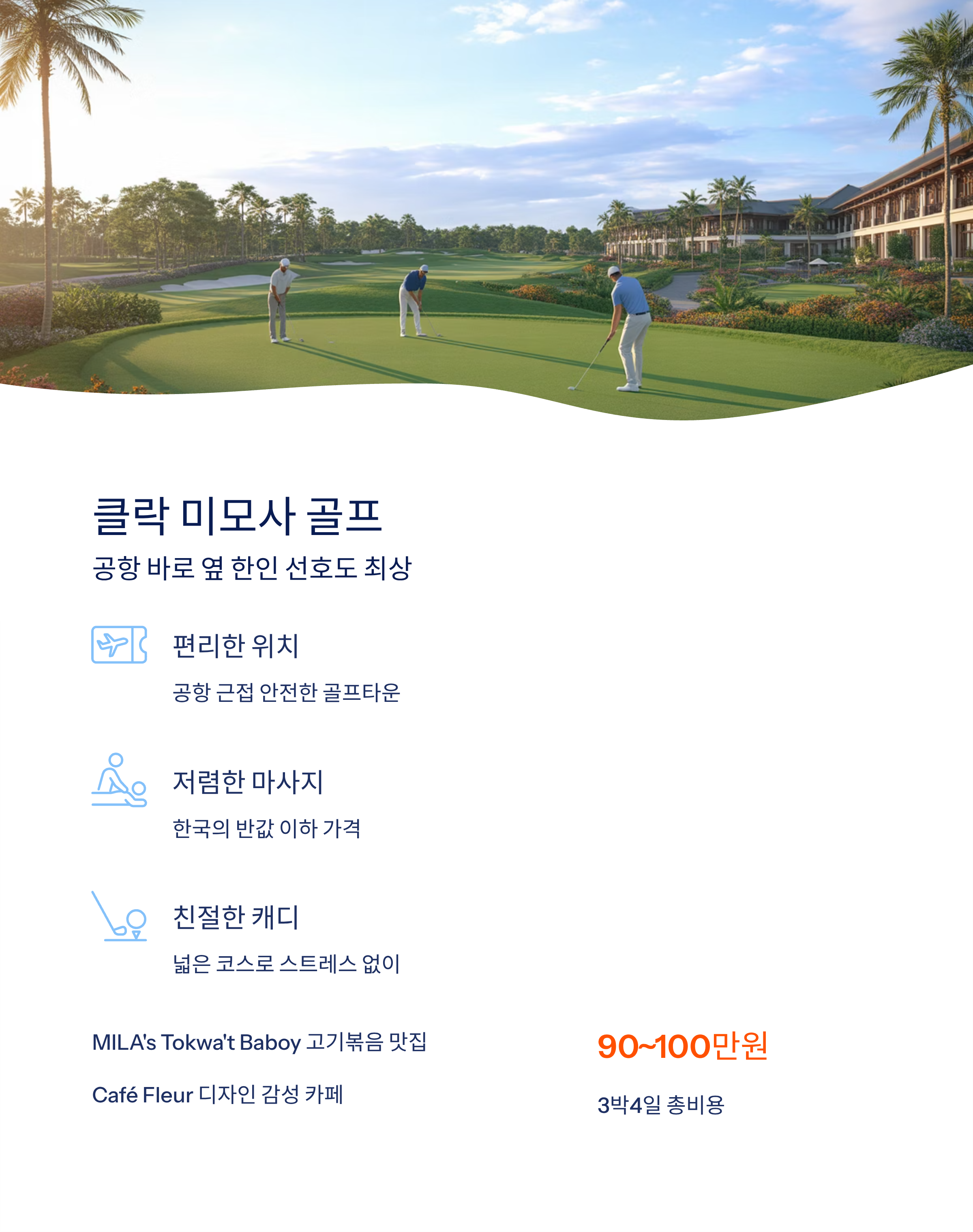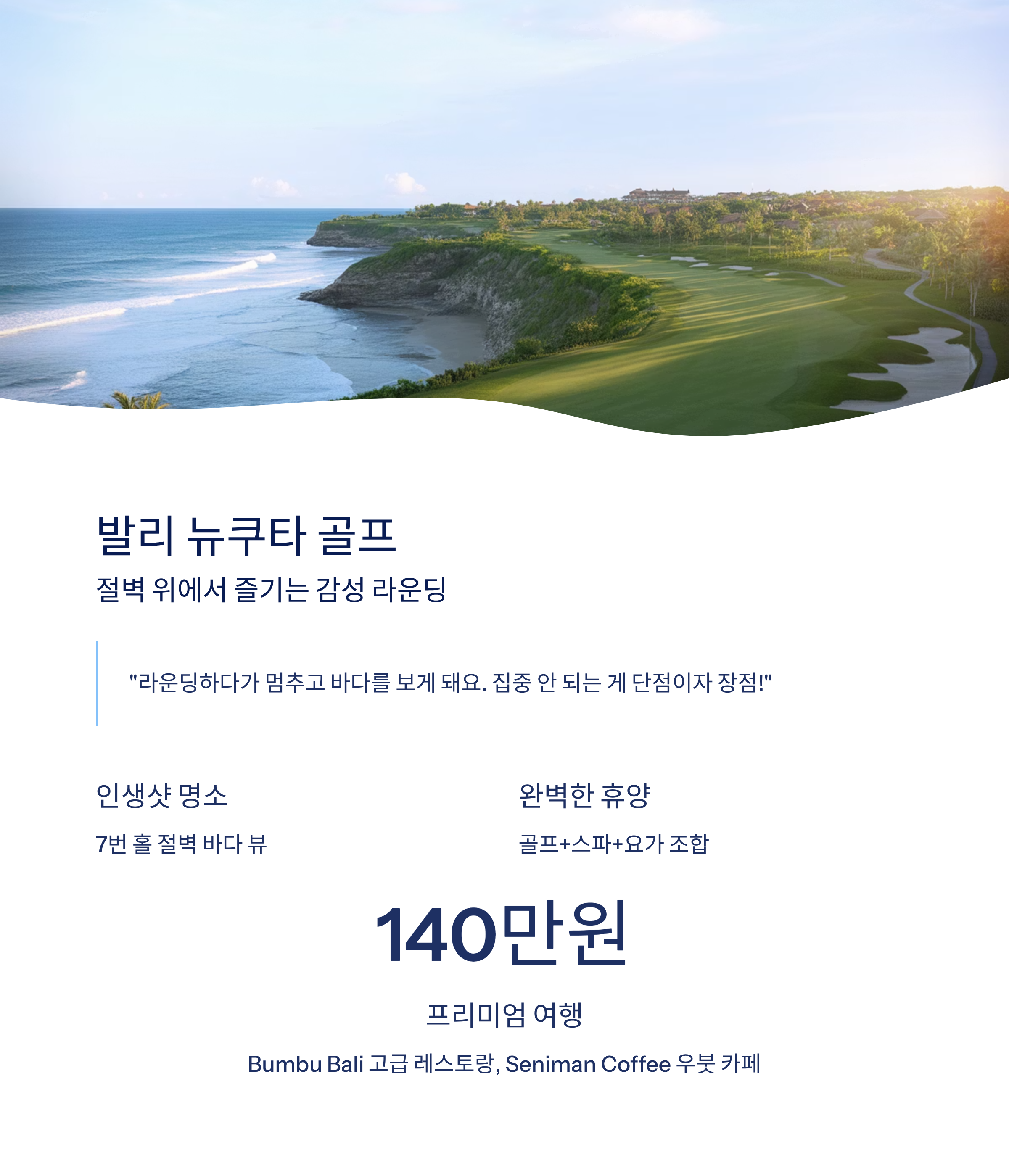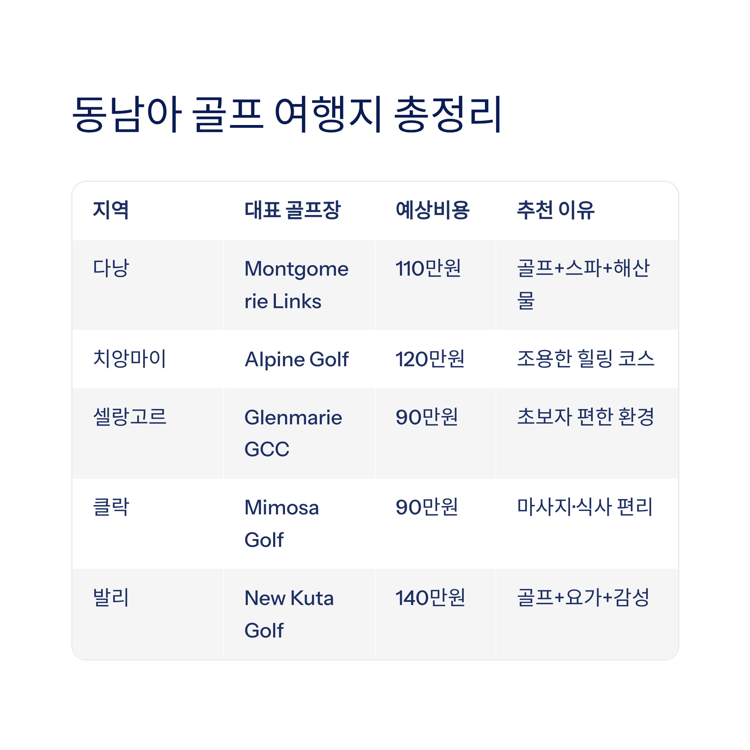 다낭 Montgomerie Links 약 110~120만원 바다 전망 링크스 골프+스파+해산물 세트 치앙마이 Alpine Golf Resort 약 120~130만원 산악형 힐링 골프 조용하고 집중도 높은 코스 셀랑고르 Glenmarie GCC 약 90~100만원 도심 속 접근성 초보자도 편한 환경 클락 Mimosa Golf 약 90~100만원 공항 근접, 한인 선호 마사지·식사 편한 구조 발리 New Kuta Golf 약 140~150만원 절벽 뷰 감성 코스 골프+요가+감성 여행 조합
