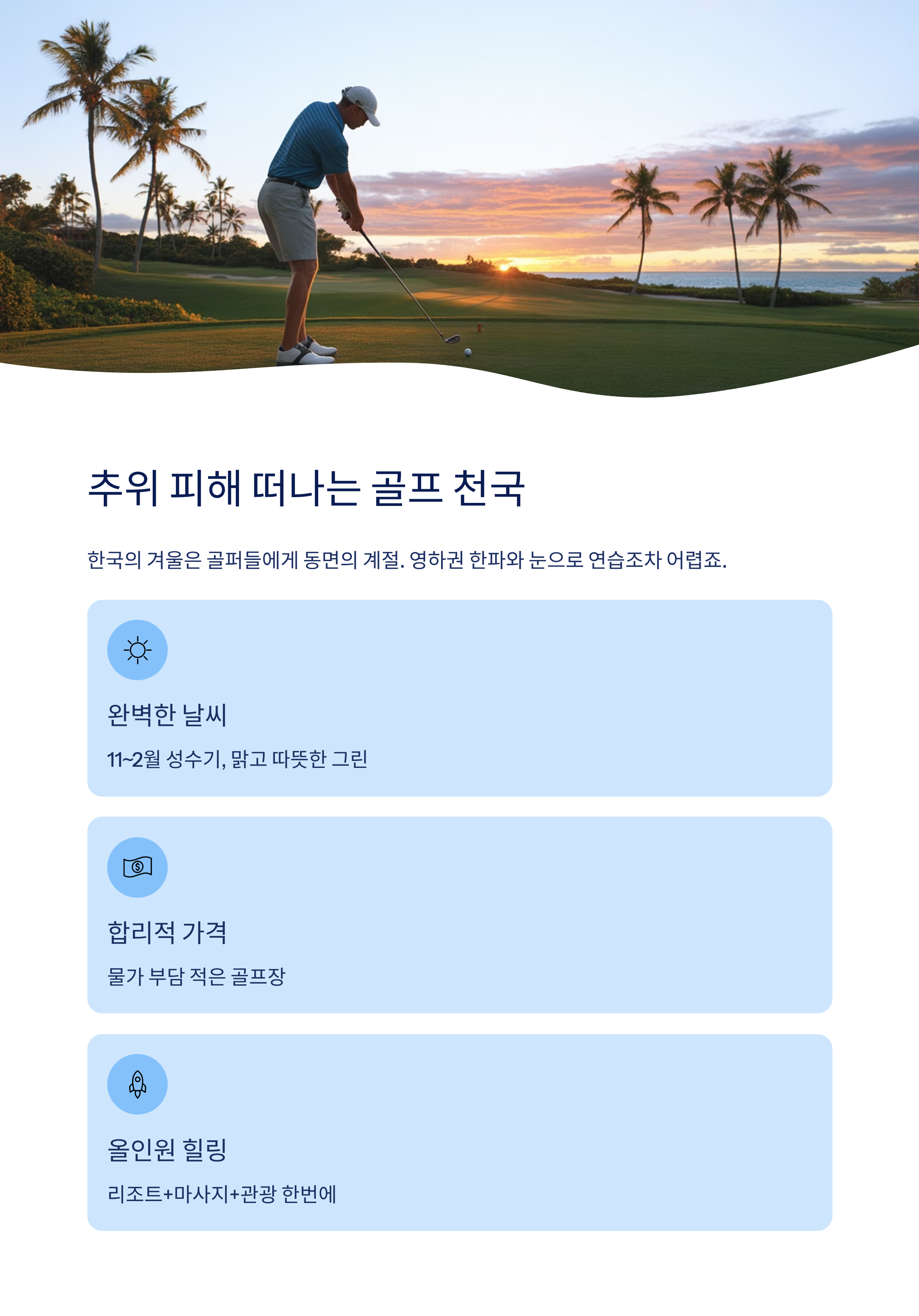 11월~2월은 동남아 골프의 성수기이자 ‘골프 하기 딱 좋은 계절’이에요. 이맘때 골프 마니아부터 초보 골퍼, 가족 단위 여행자까지 모두 동남아로 떠나는 이유는 명확합니다.