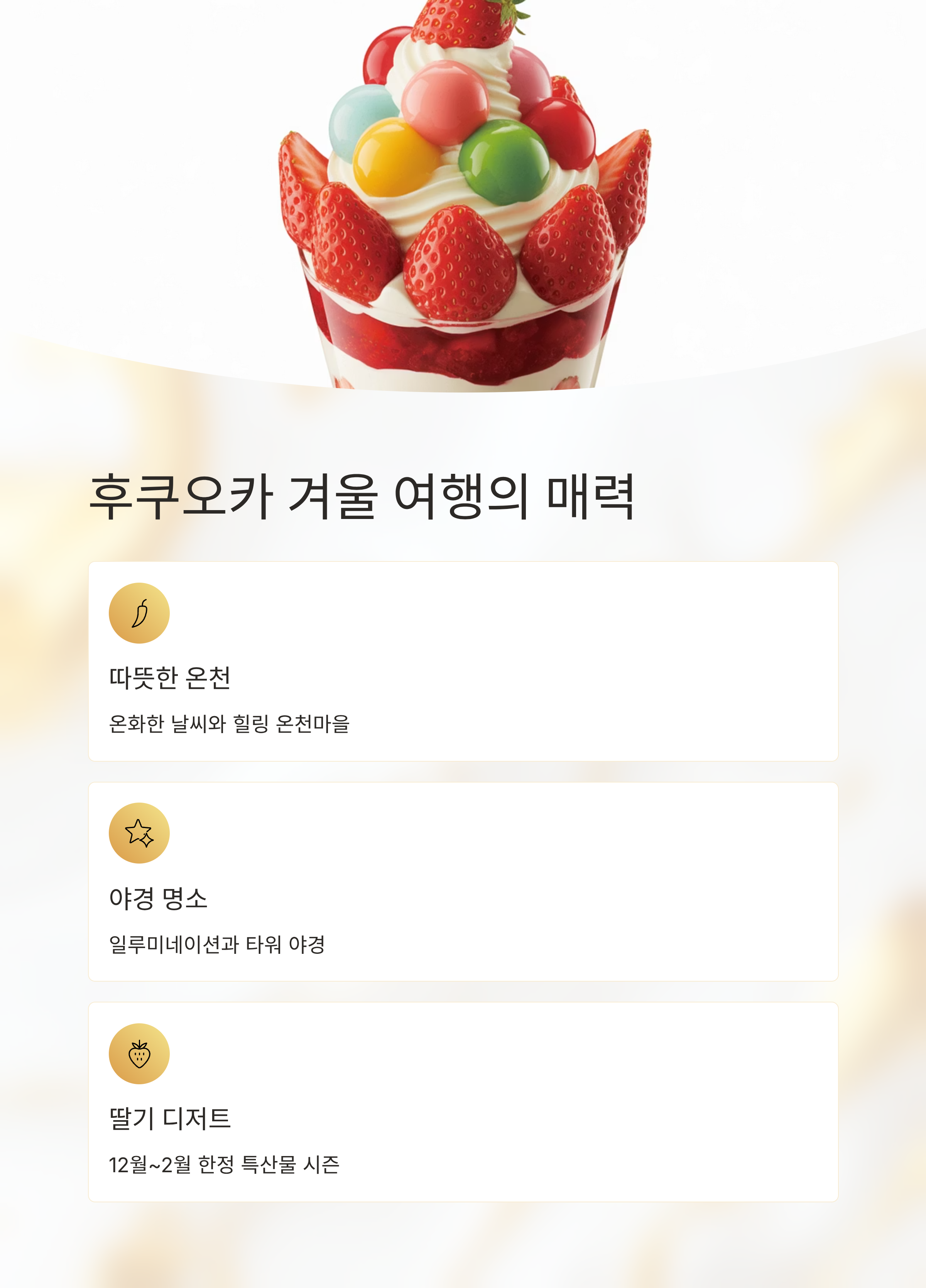 겨울에도 비교적 온화한 날씨 덕분에 부담 없이 즐길 수 있는 후쿠오카 겨울 여행. 따뜻한 온천과 야경 명소, 당일치기 소도시 여행까지 매력이 넘칩니다. 특히 12월부터 2월은 지역 특산물인 딸기 디저트 시즌이 한창이라 카페 투어를 겸한 여행자들도 많아요.