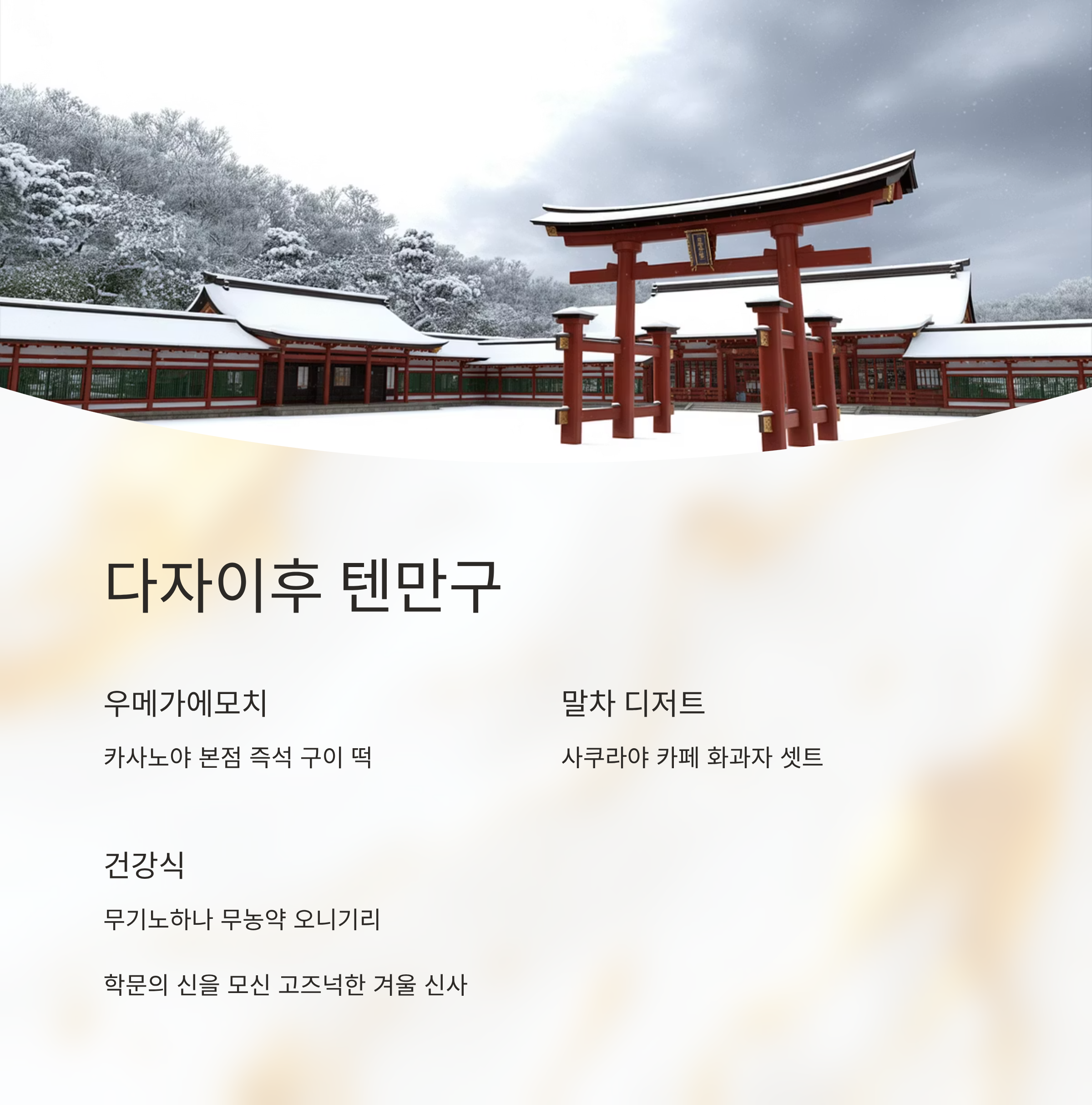 학문의 신 ‘스가와라 미치자네’를 모신 신사. 겨울이면 붐비지 않아 산책하기 제격이고, 주변 상점거리엔 먹거리가 풍성해요.즐길거리