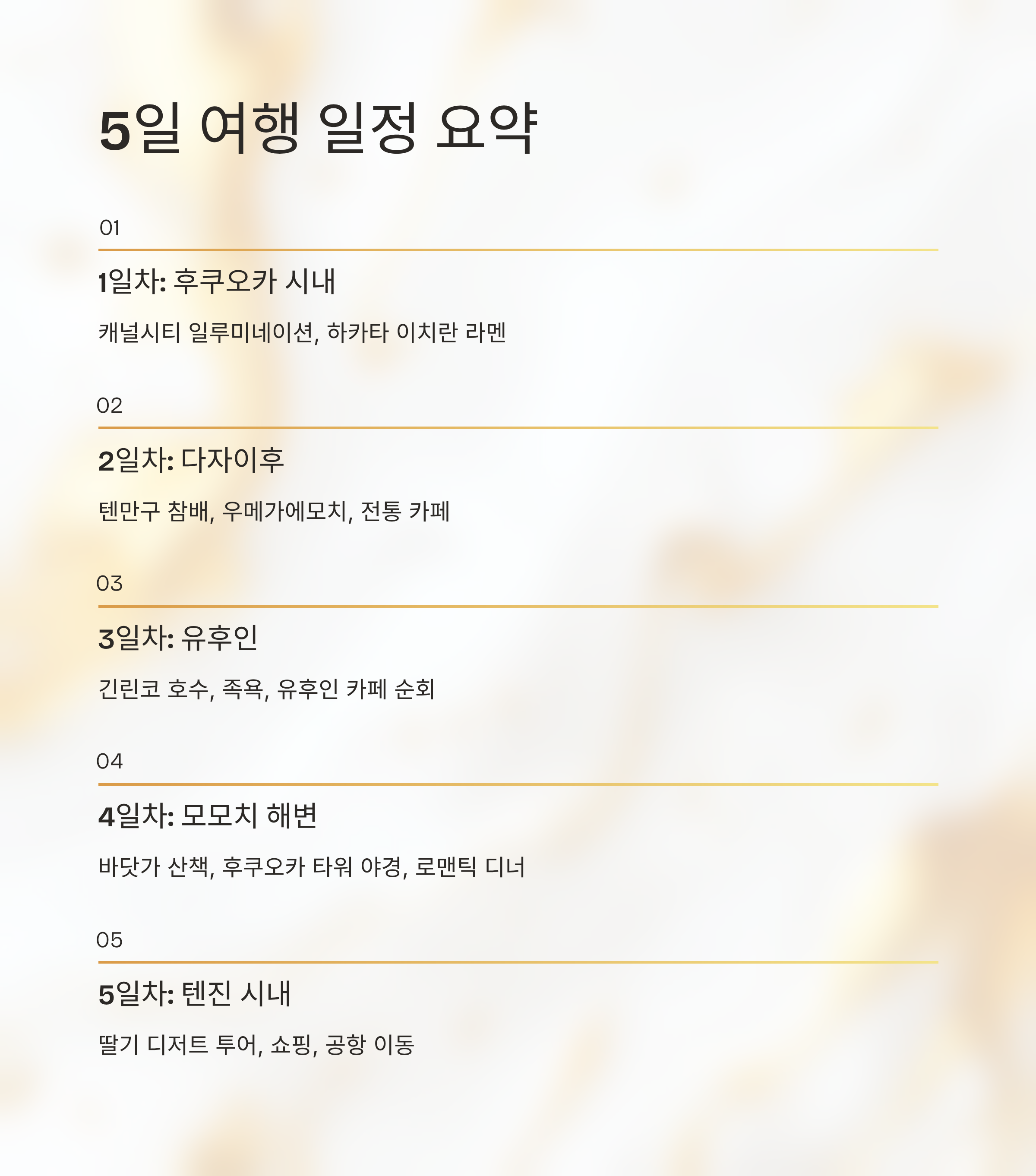 1일차 후쿠오카 시내 캐널시티 일루미네이션 관람, 하카타 이치란 라멘 2일차 다자이후 이동 텐만구 참배, 우메가에모치, 전통 카페 투어 3일차 유후인 당일치기 긴린코 호수, 족욕, 유후인 카페 순회 4일차 모모치 해변 바닷가 산책, 후쿠오카 타워 야경 감상, 로맨틱 디너 5일차 텐진 시내 딸기 디저트 투어, 쇼핑, 공항으로 이동