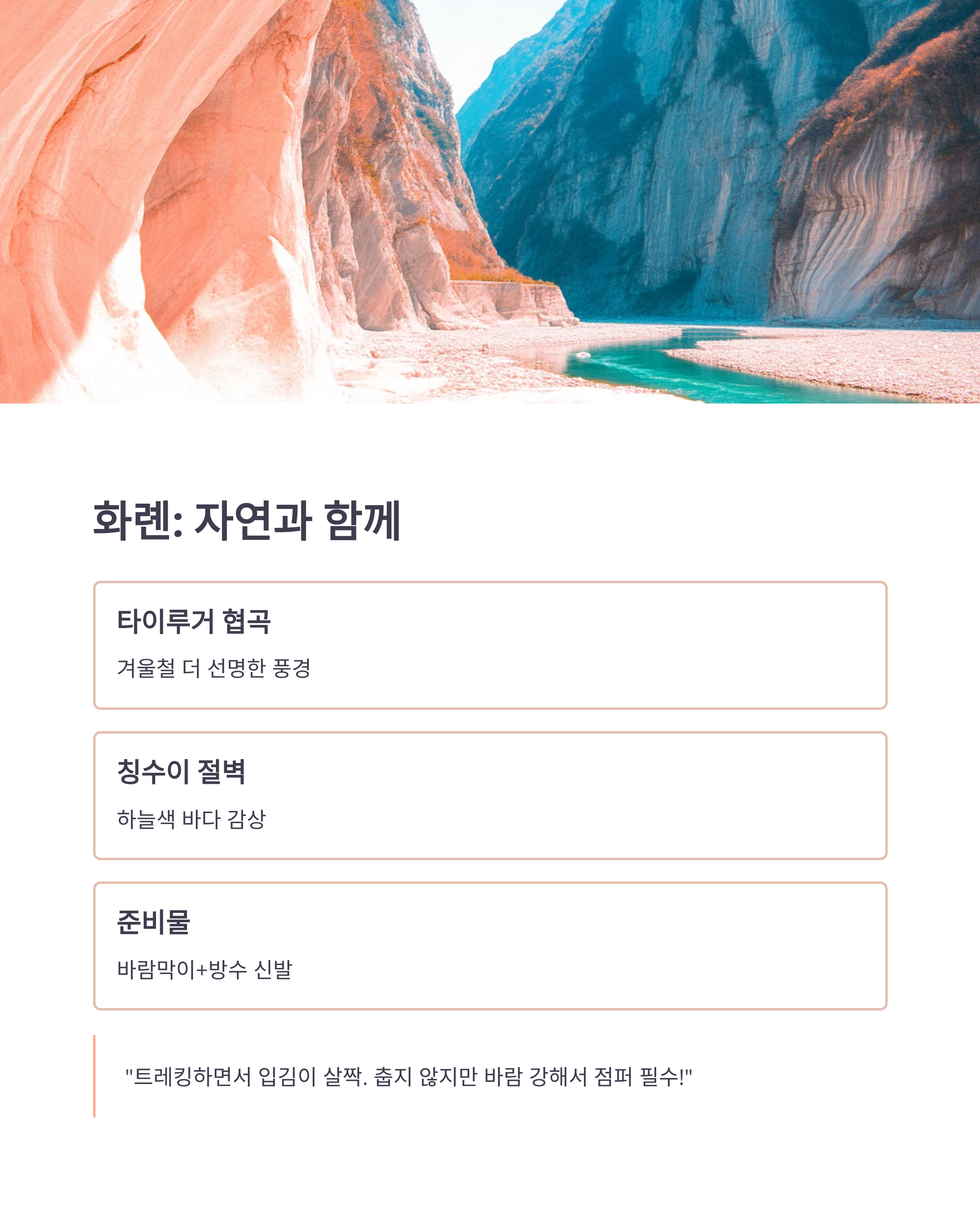 타이루거 협곡 트레킹, 칭수이 절벽 감상, 화롄 야시장 방문포토스팟