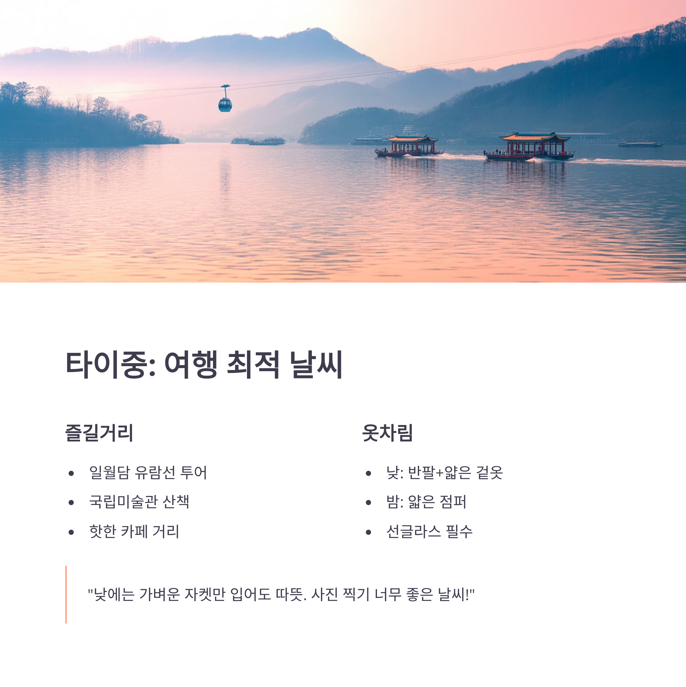 “낮에는 가벼운 자켓만 입어도 따뜻했어요. 사진 찍기 너무 좋은 날씨! 밤엔 조금 쌀쌀해서 숄 하나 걸치면 좋더라고요.”타이중 겨울 옷차림 팁