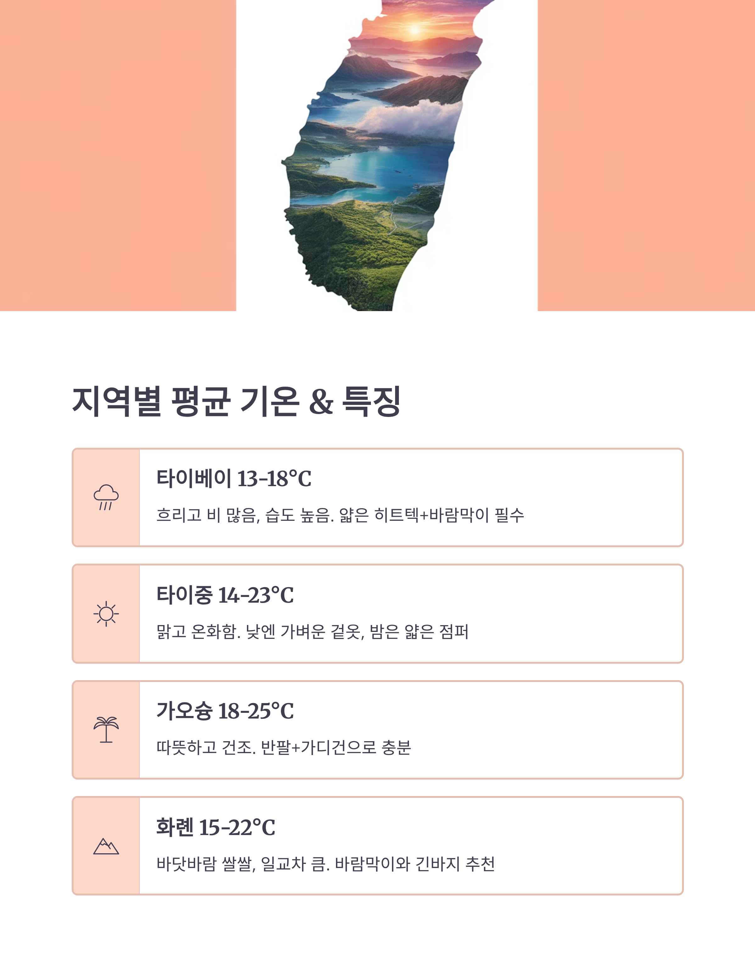 타이베이 13~18도 흐리고 비 오는 날 많음, 습도 높음 얇은 히트텍+바람막이 필수 타이중 14~23도 대체로 맑음, 온화한 날씨 낮엔 가벼운 겉옷, 아침/밤은 얇은 점퍼 가오슝 18~25도 겨울답지 않게 따뜻하고 건조함 반팔+가디건 정도로 OK 화롄/타이둥 15~22도 바닷바람 쌀쌀, 일교차 큼 바람막이와 긴바지 추천 ※ 강수량은 타이베이 기준 월 평균 110~150mm 수준, 우산이나 방수 재킷은 필수입니다.
