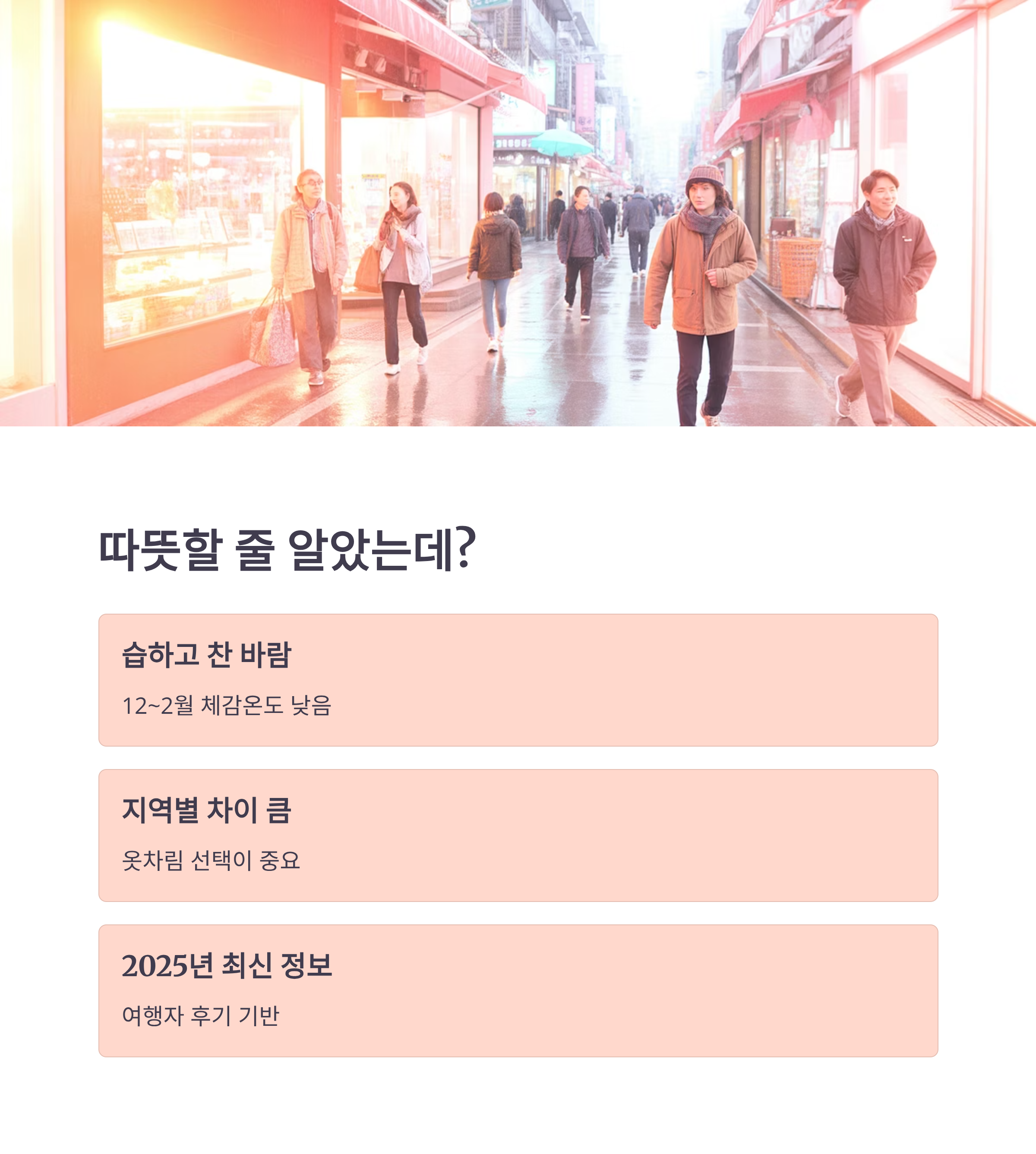 지역 평균 기온 (12~2월) 날씨 특징 체감온도 팁