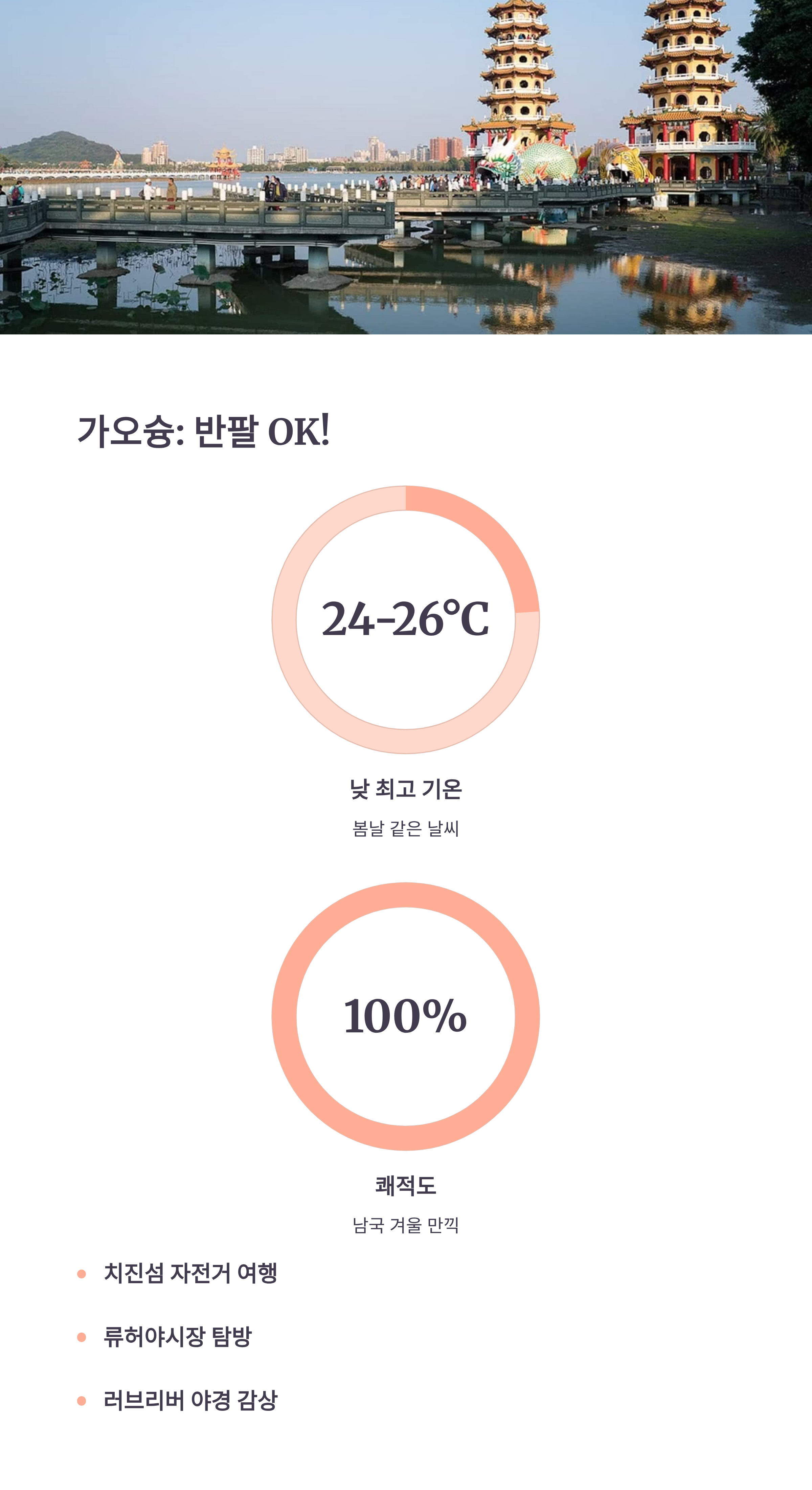 “12월 중순인데 반팔 입고 돌아다녔어요. 바다에서 해 질 때는 가디건 하나 걸쳤고요. 정말 쾌적했어요.”가오슝 겨울 옷차림 팁