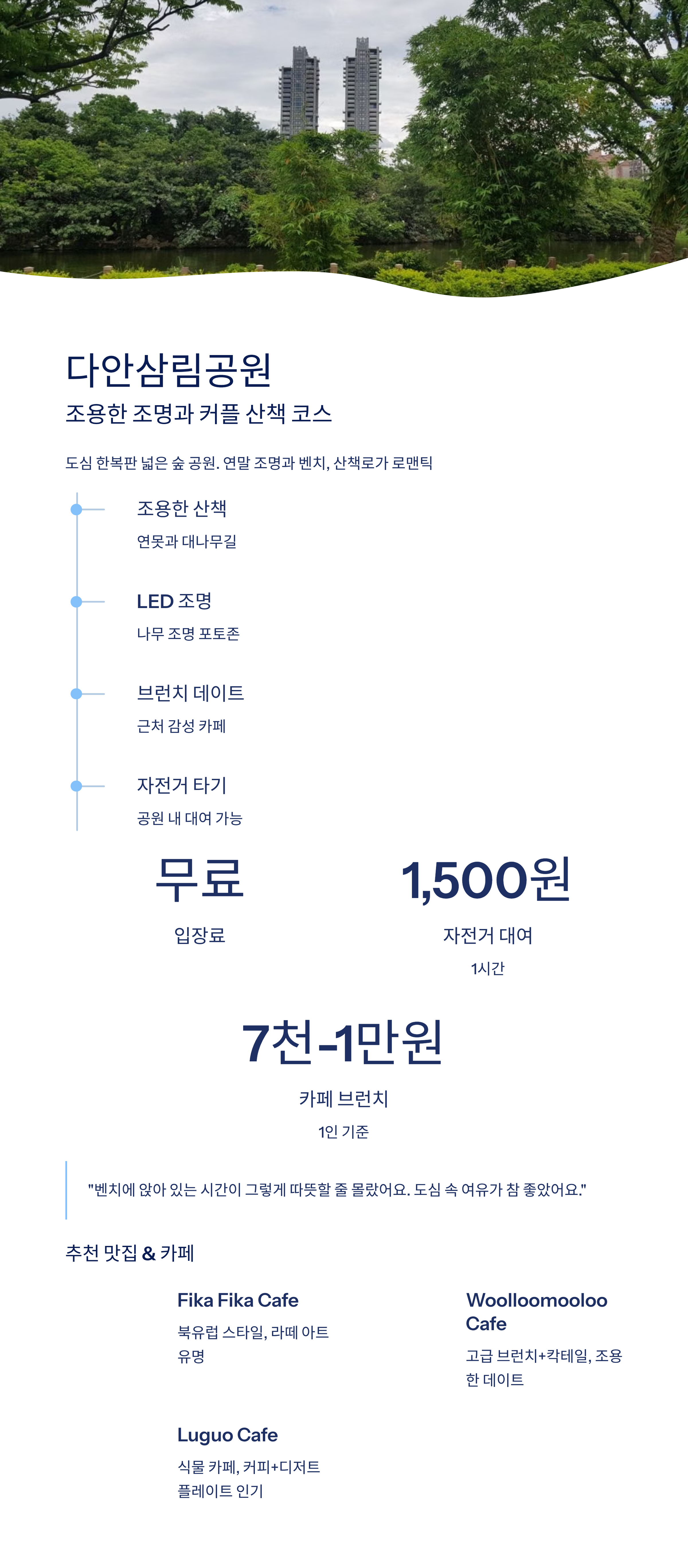 “아무 말 없이 벤치에 앉아 있는 시간이 그렇게 따뜻할 줄 몰랐어요. 도심 속에 이런 여유가 있다는 게 참 좋았어요.”맛집 & 카페 추천