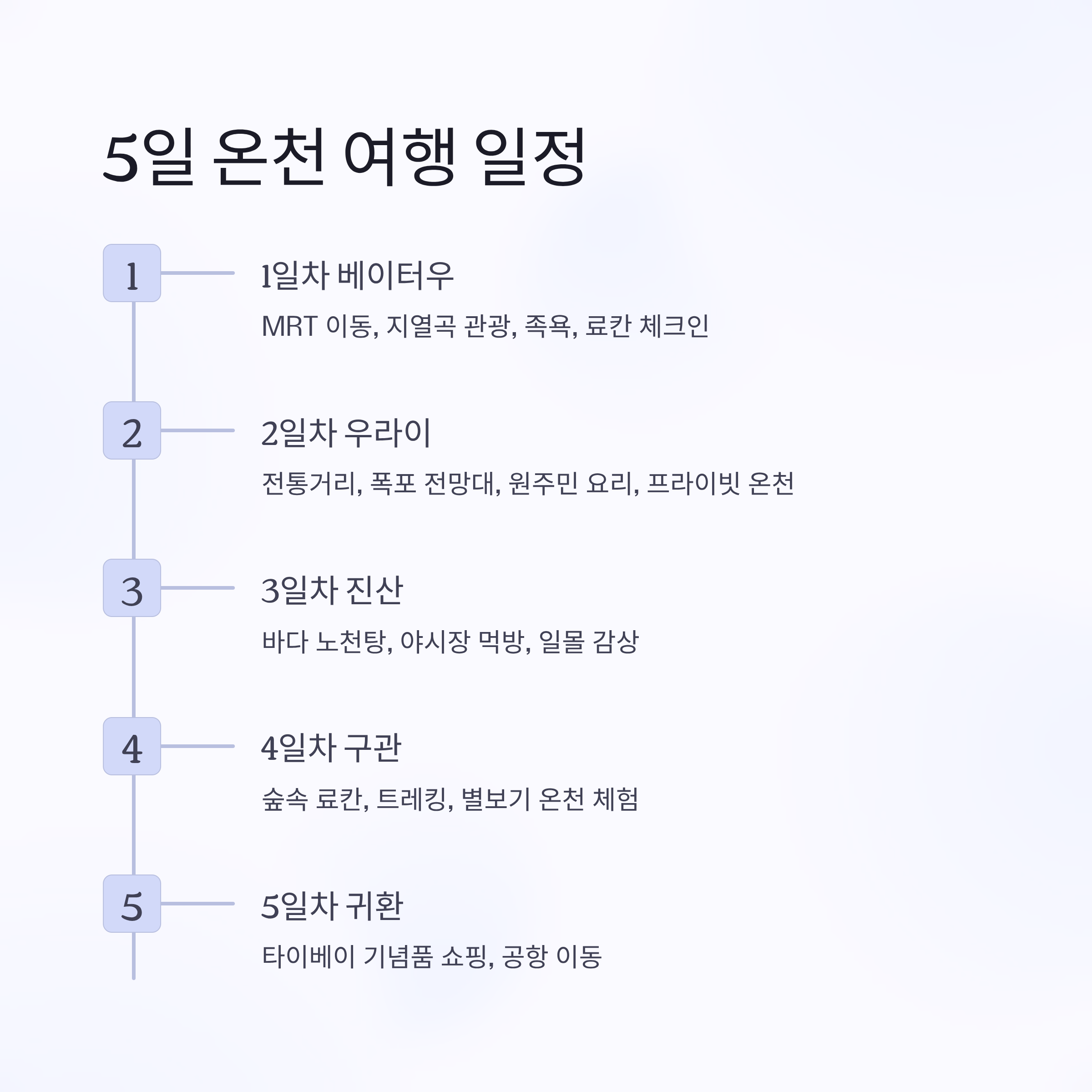 1일차 베이터우 MRT 이동, 지열곡 관광, 족욕, 온천 료칸 체크인 2일차 우라이 전통거리 산책, 폭포 전망대, 원주민 요리 체험, 프라이빗 온천 룸 3일차 진산 바다 노천탕 체험, 야시장 먹방, 일몰 감상 4일차 구관 숲속 료칸 이동, 트레킹, 별보기 온천 체험 5일차 타이베이 귀환 기념품 쇼핑, 공항 이동
