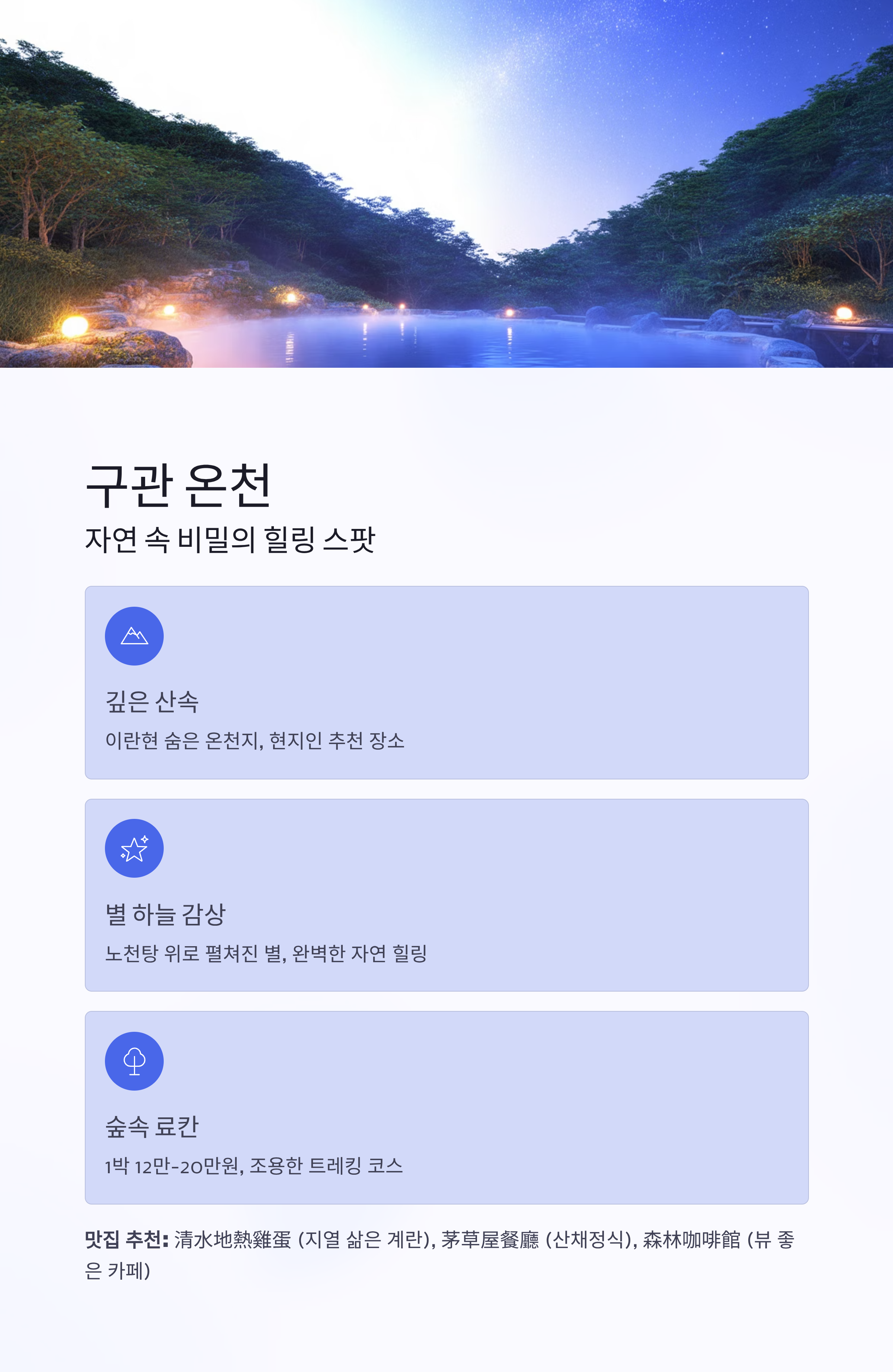 노천탕 위로 펼쳐진 별 하늘, 숲길 따라 걷는 산책로예상 비용