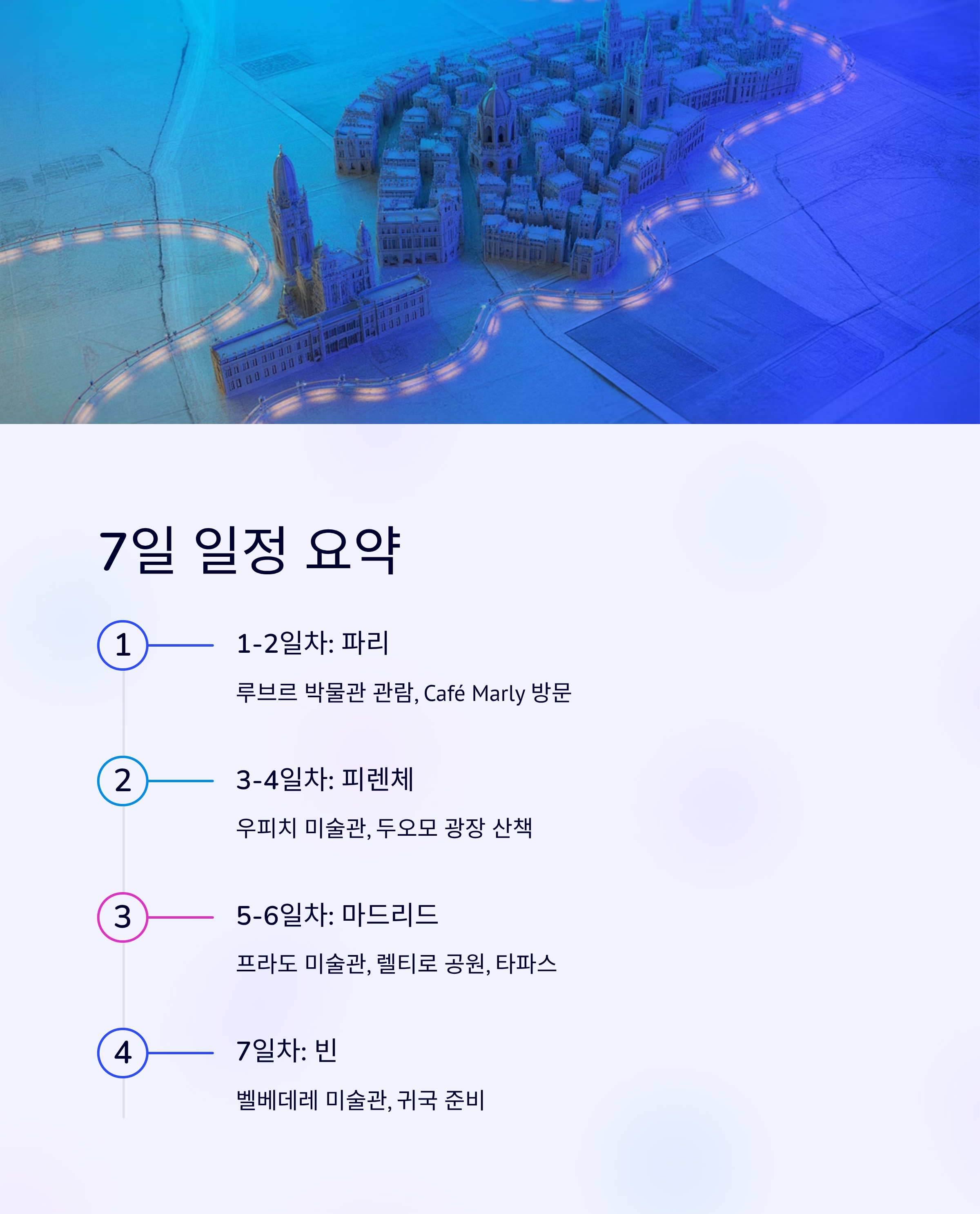 1일차 인천 출발 → 파리 도착 파리 루브르 야경 감상 2일차 루브르 박물관 본격 관람 파리 카페 마를리 방문 3일차 피렌체 이동 피렌체 시내 관광 및 카페 길리 4일차 우피치 미술관 감상 피렌체 두오모 광장 산책 5일차 마드리드 도착 및 산책 마드리드 렐티로 공원 6일차 프라도 미술관 관람 마드리드 타파스 저녁 7일차 빈 도착 및 벨베데레 관람 빈 귀국 준비