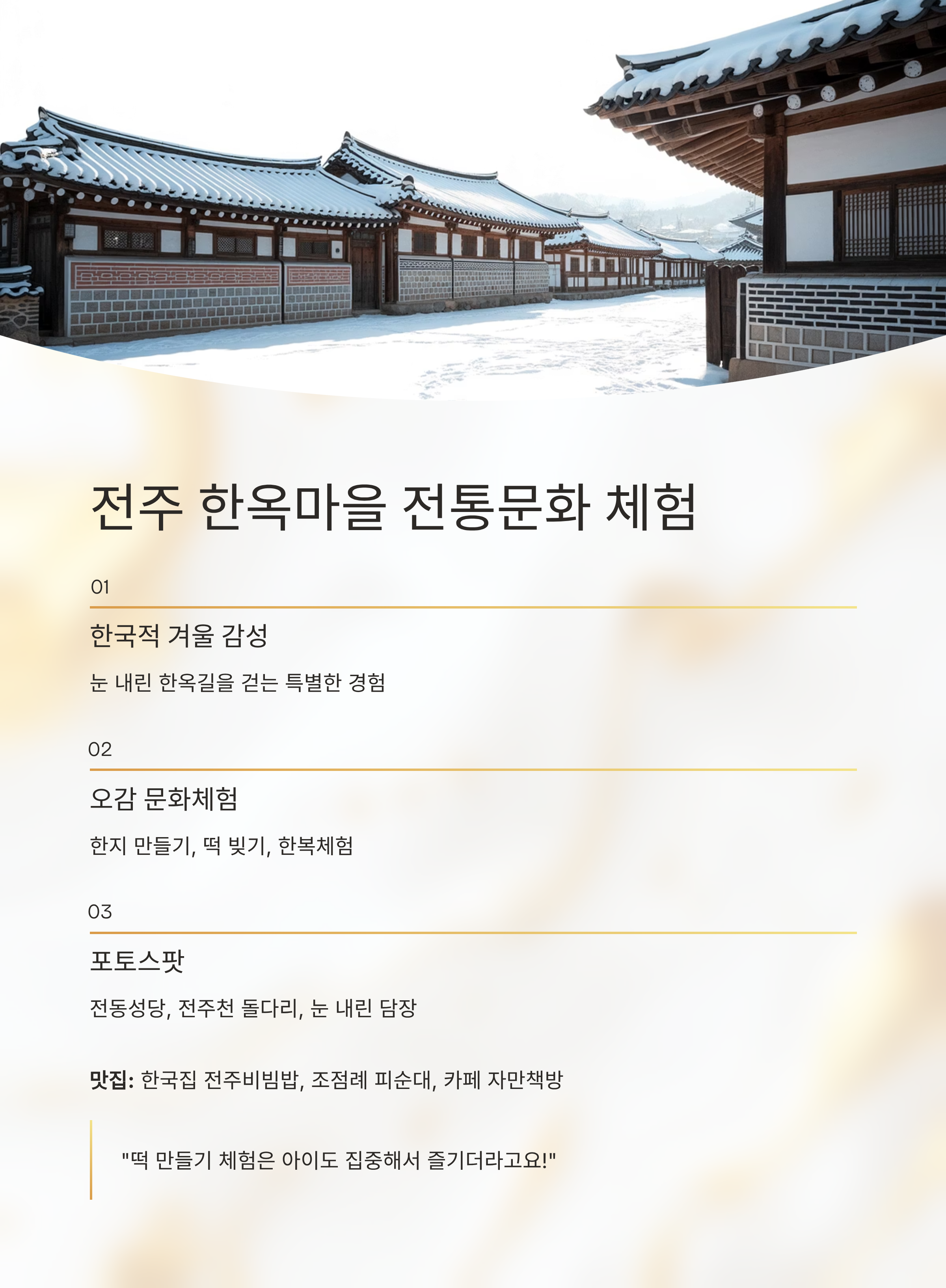 눈 내린 한옥길을 걷는 것만으로도 감성이 가득합니다. 여기에 아이와 함께 한지 만들기, 떡 빚기 등 다양한 문화체험을 더하면 단순한 관광이 아닌 ‘경험’이 되는 여행이 되죠.