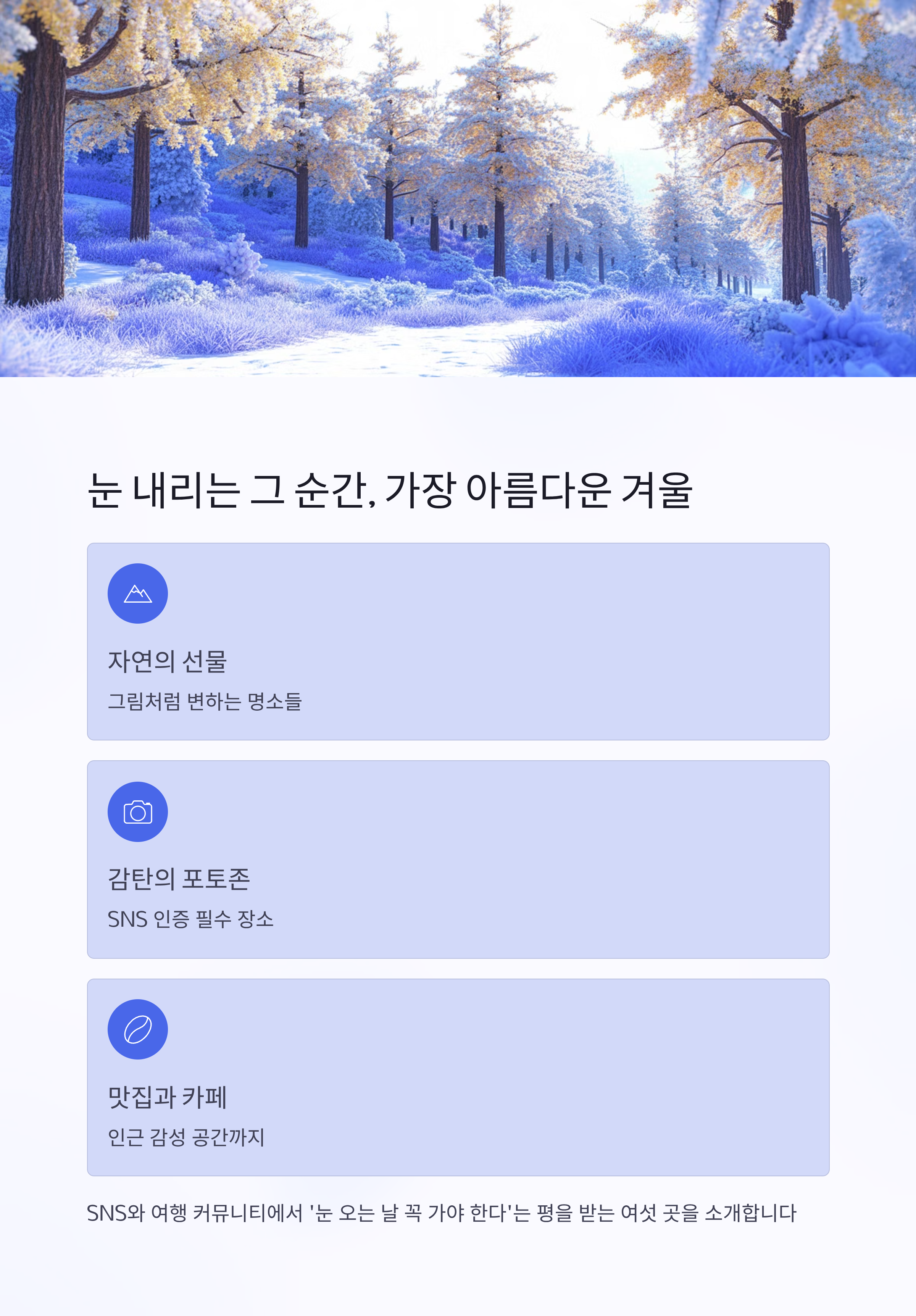 자연이 선물하는 가장 순수한 장면이죠. 국내에는 눈이 올 때마다 그림처럼 변하는 명소들이 여럿 있습니다. 이번 글에서는 SNS, 네이버 후기, 여행 커뮤니티에서 ‘눈 오는 날 꼭 가야 한다’는 평을 받는 설경 스팟 여섯 곳을 소개합니다.