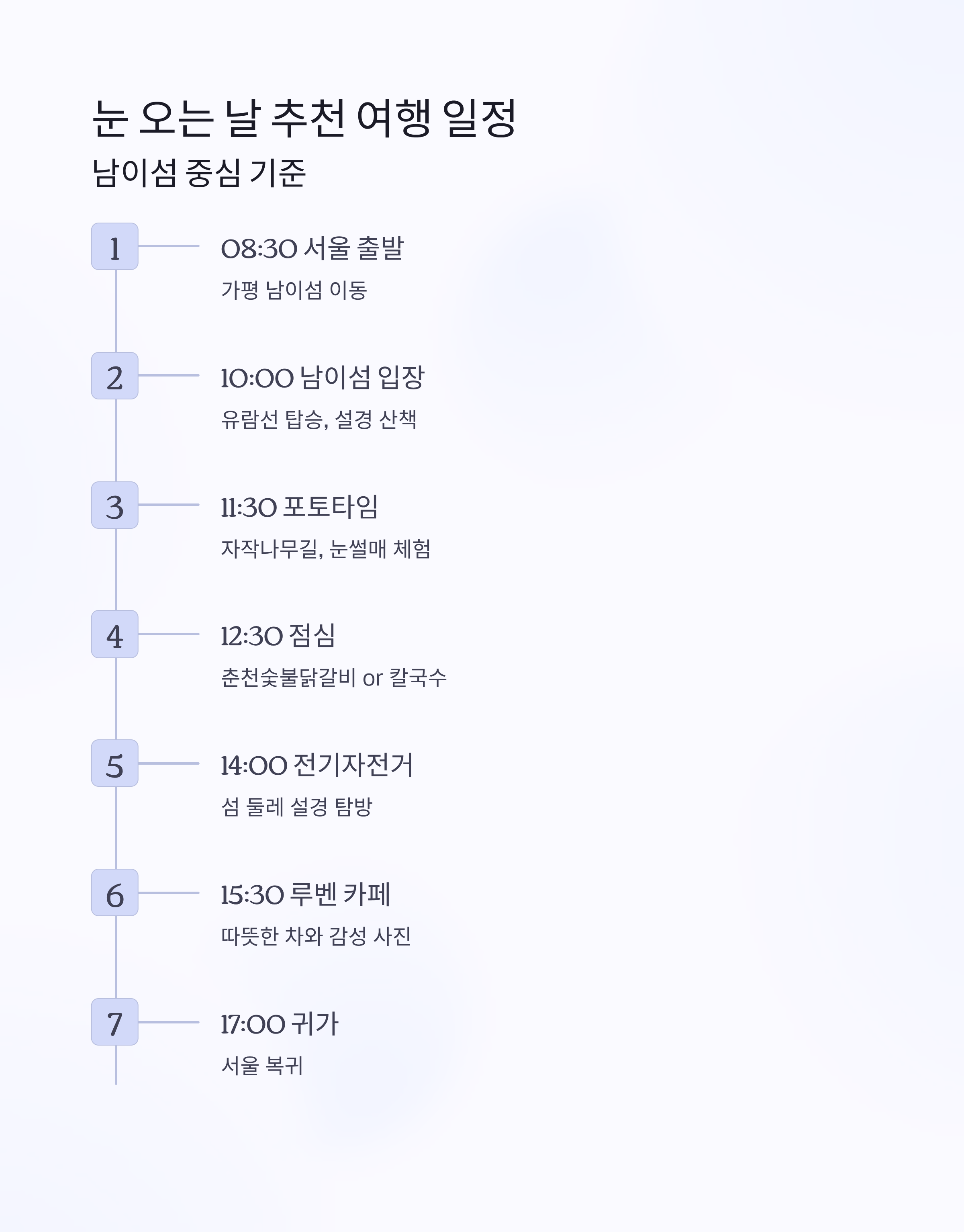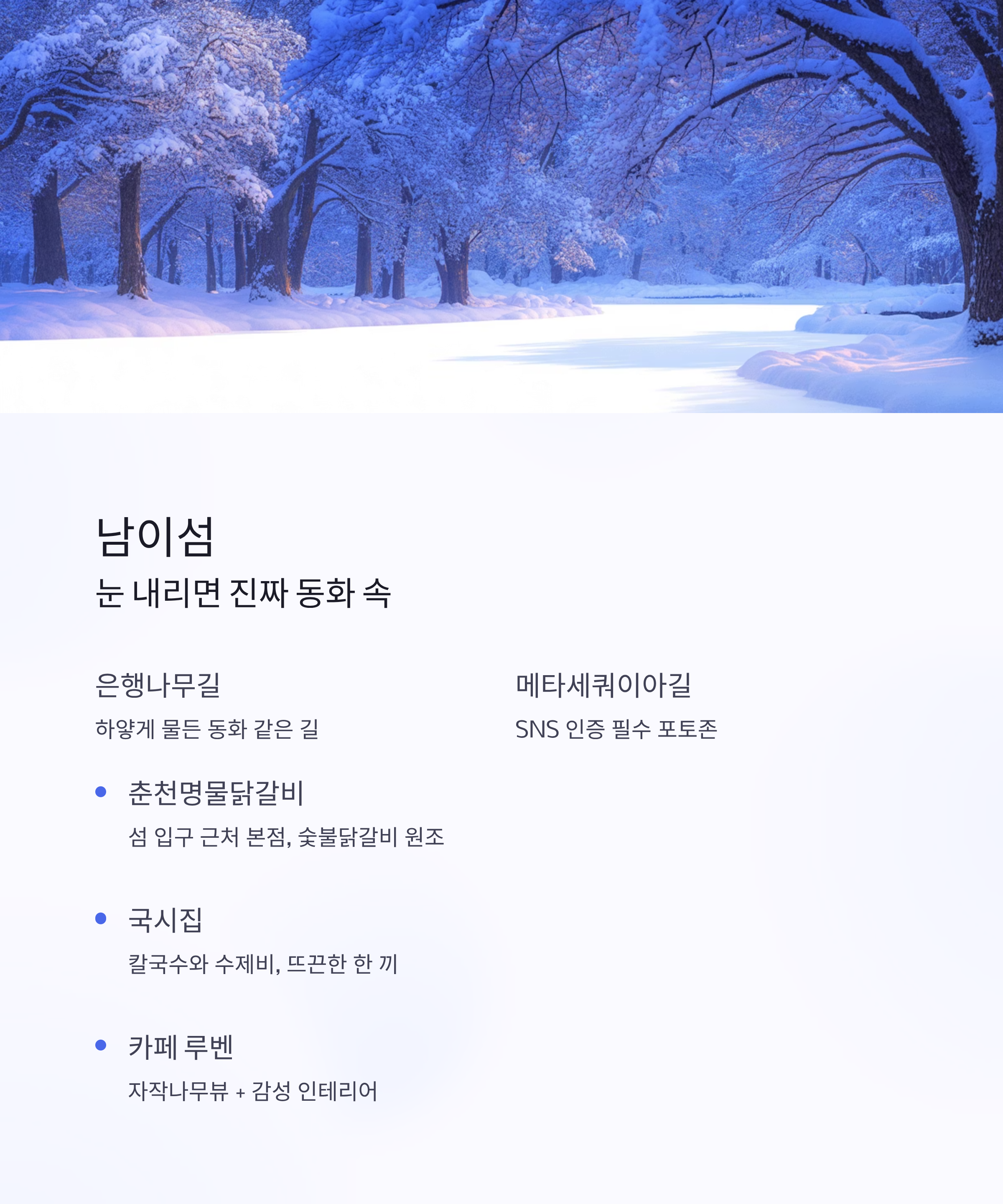 눈 오는 날 추천 여행 일정 (남이섬 중심 기준)